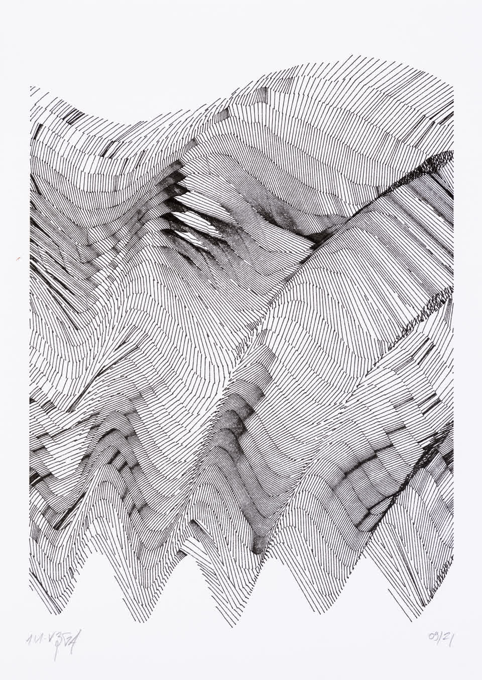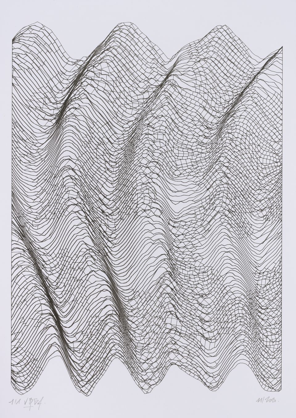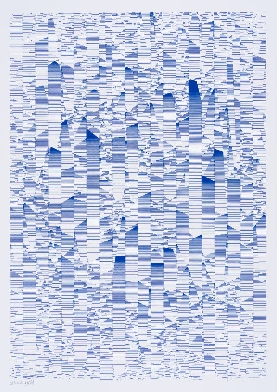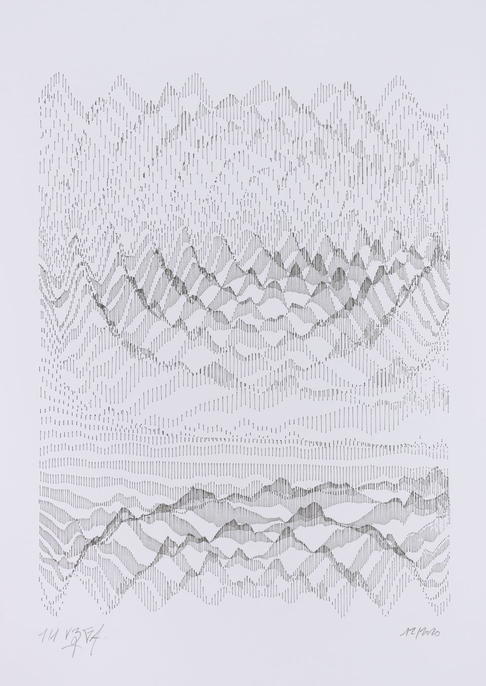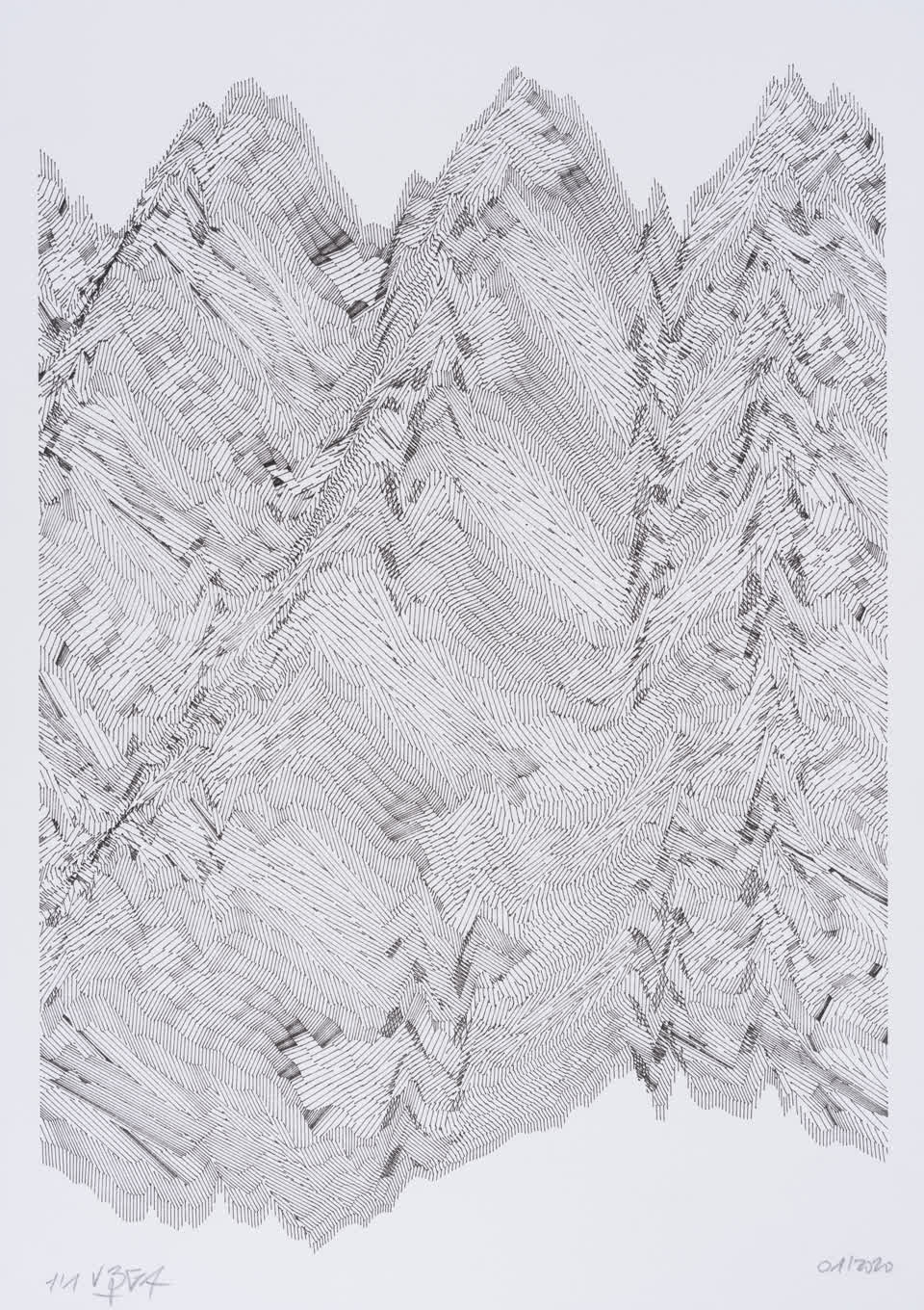 The interstices between two sine waves are then filled with vertical stripes whose orientation and density depend on some spatial rules, but also random numbers which introduce irregularities and breakage areas, resulting in mountain-like drawings.