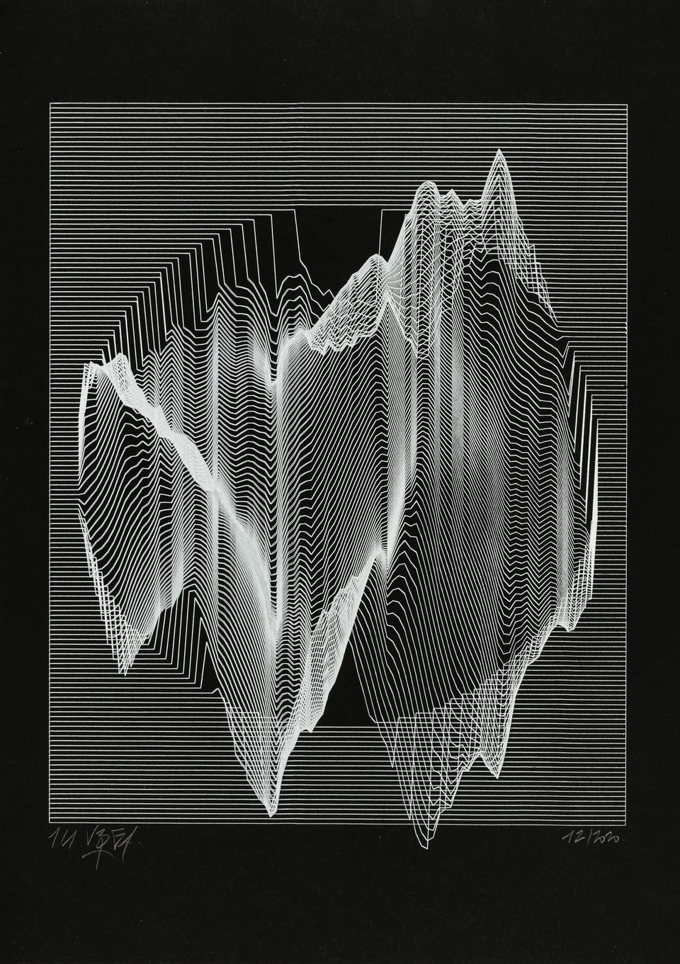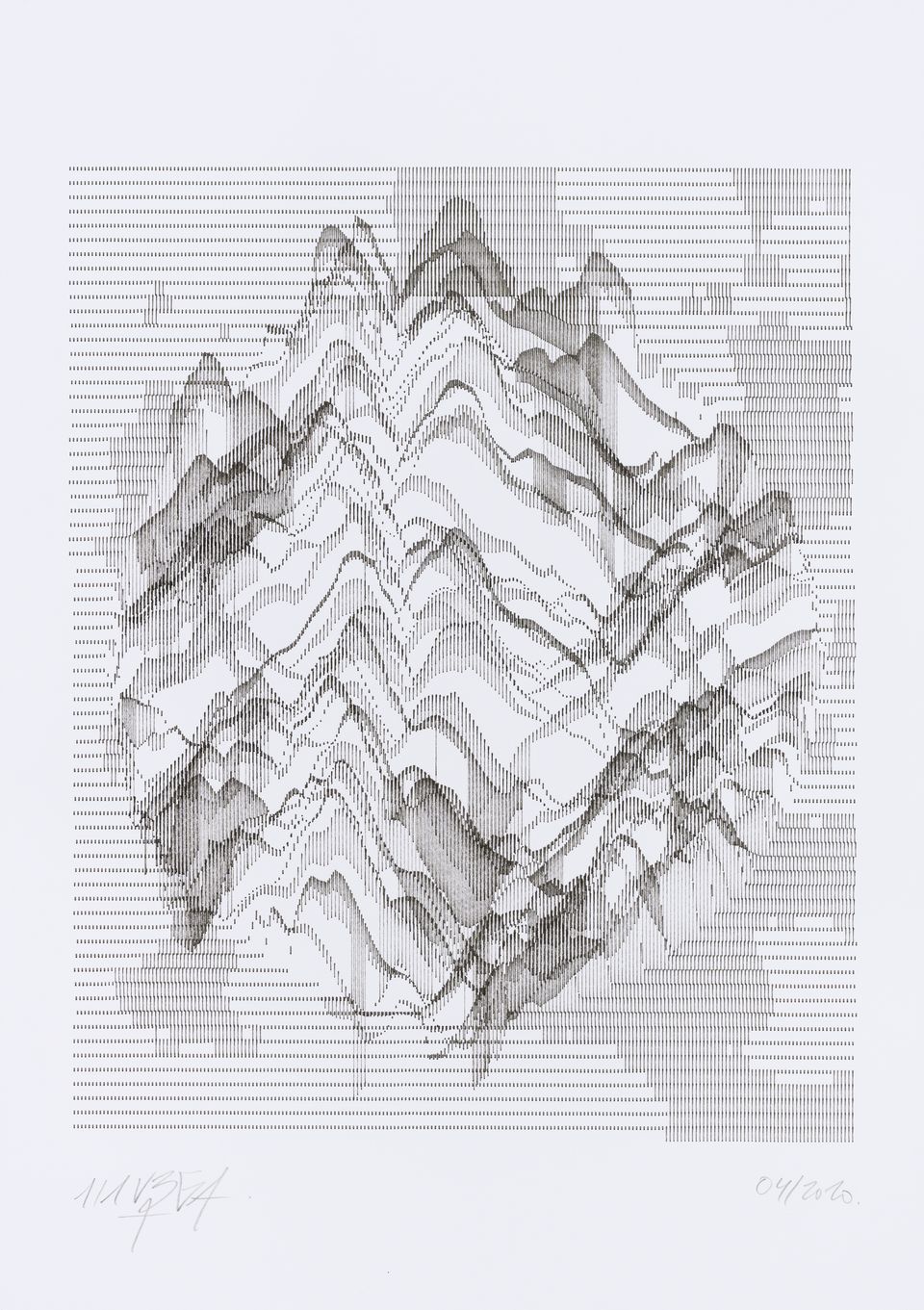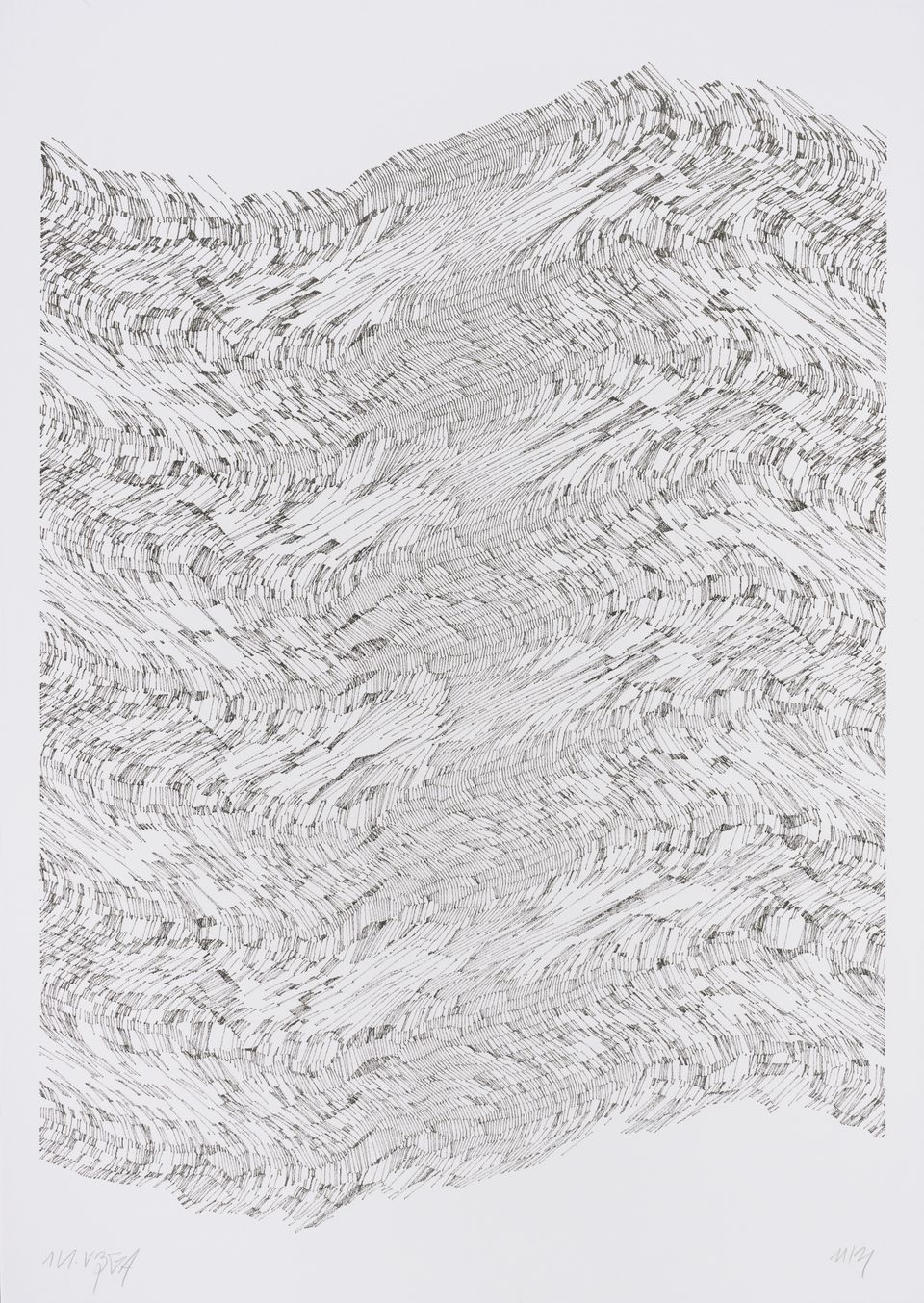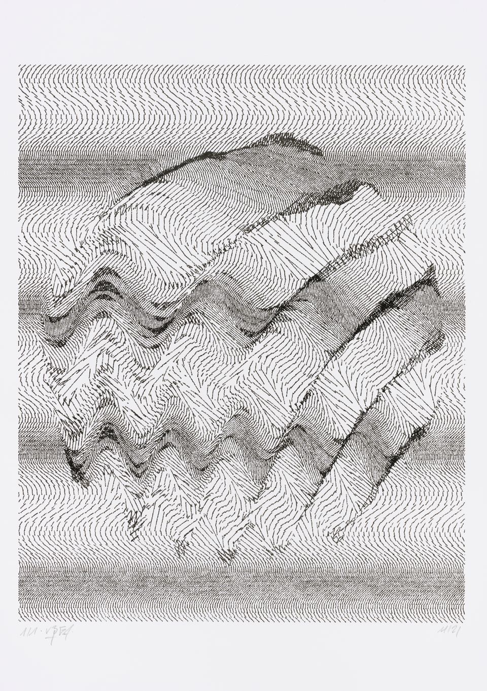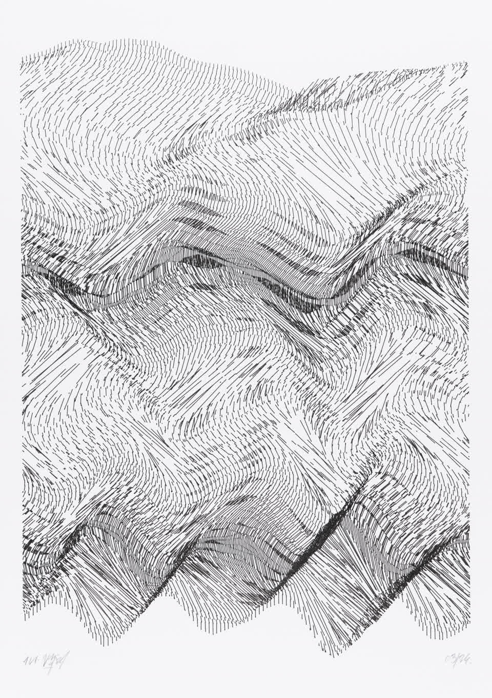 The interstices between two sine waves are then filled with vertical stripes whose orientation and density depend on some spatial rules, but also random numbers which introduce irregularities and breakage areas, resulting in mountain-like drawings.