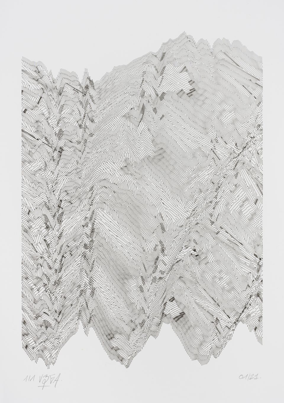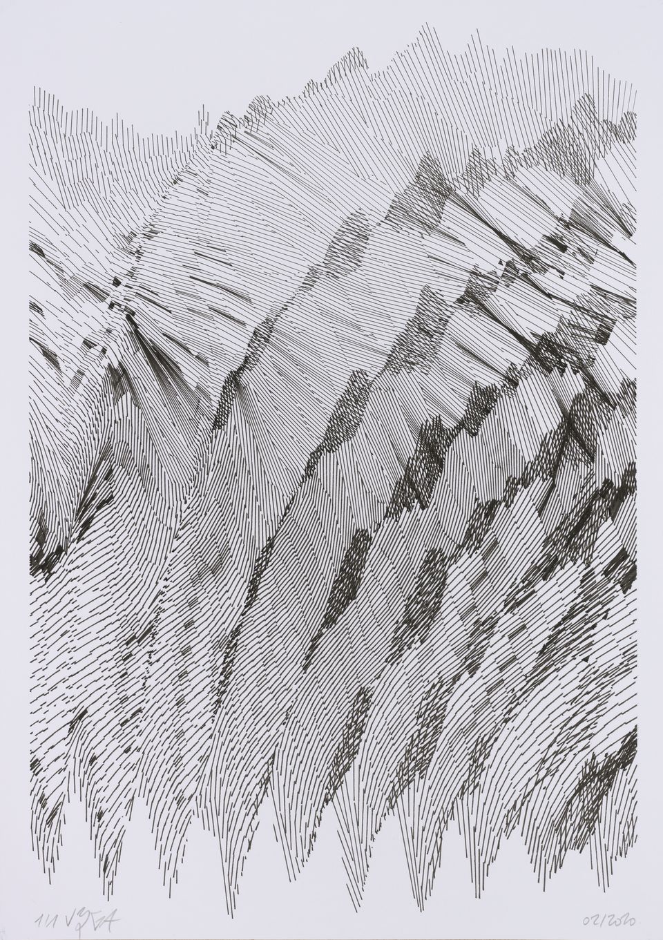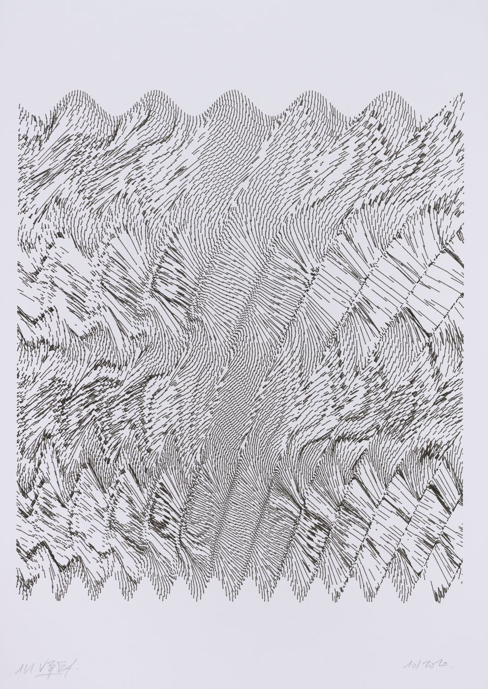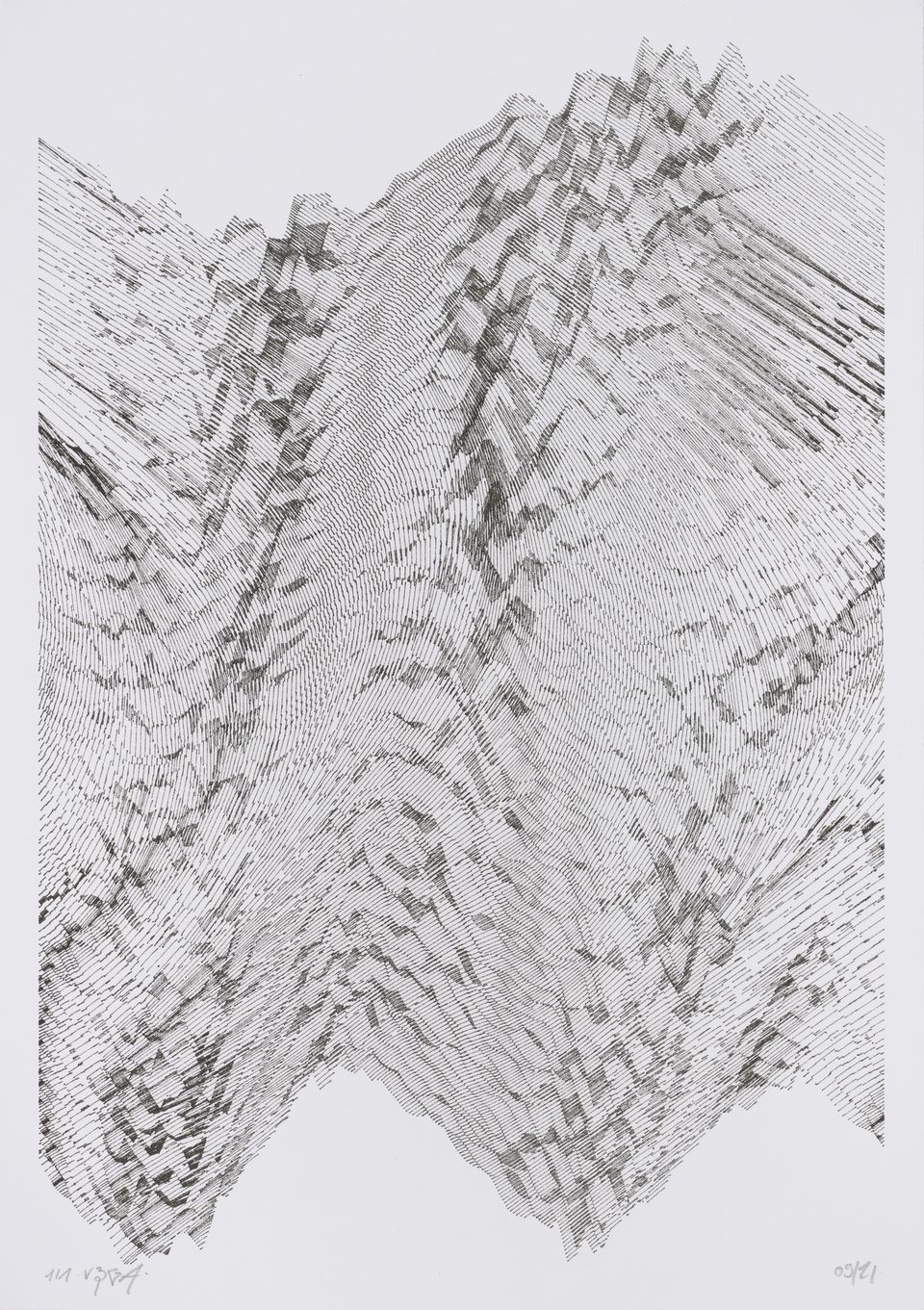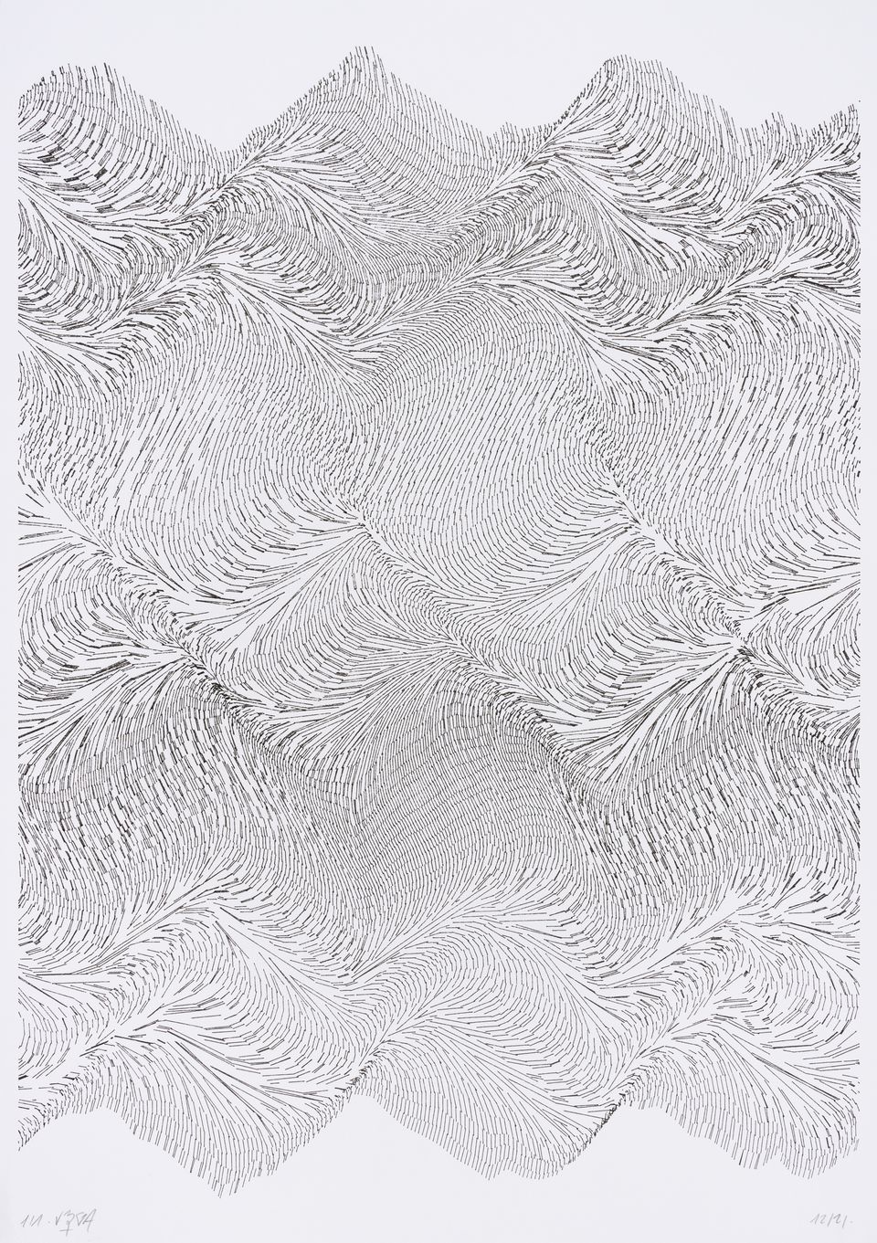 The interstices between two sine waves are then filled with vertical stripes whose orientation and density depend on some spatial rules, but also random numbers which introduce irregularities and breakage areas, resulting in mountain-like drawings.