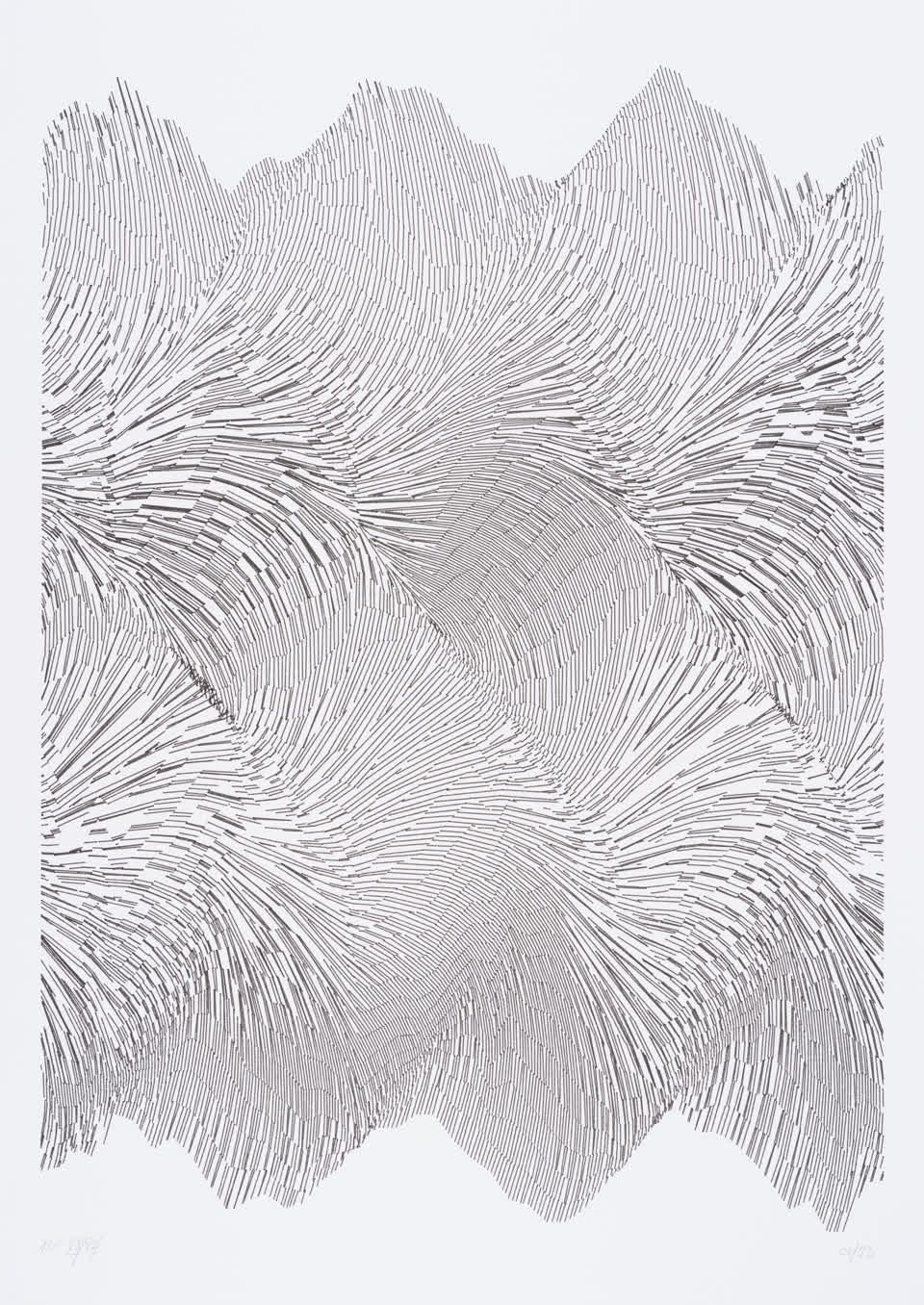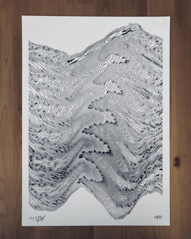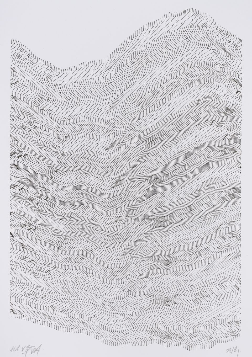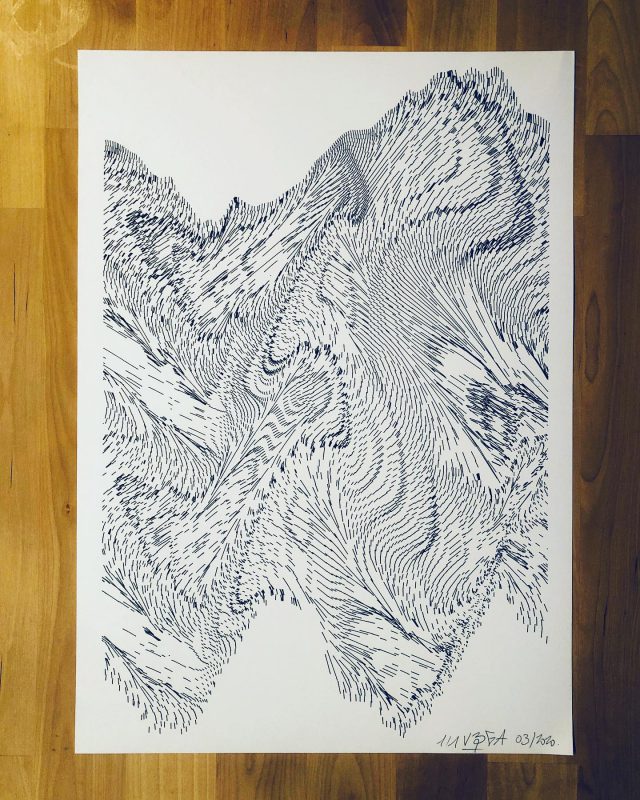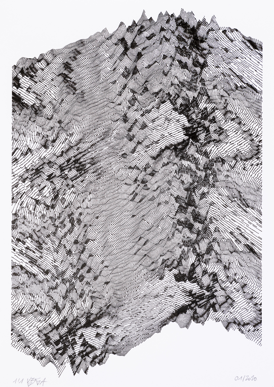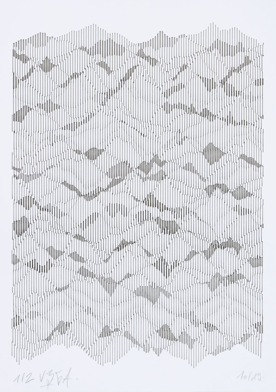 The interstices between two sine waves are then filled with vertical stripes whose orientation and density depend on some spatial rules, but also random numbers which introduce irregularities and breakage areas, resulting in mountain-like drawings.