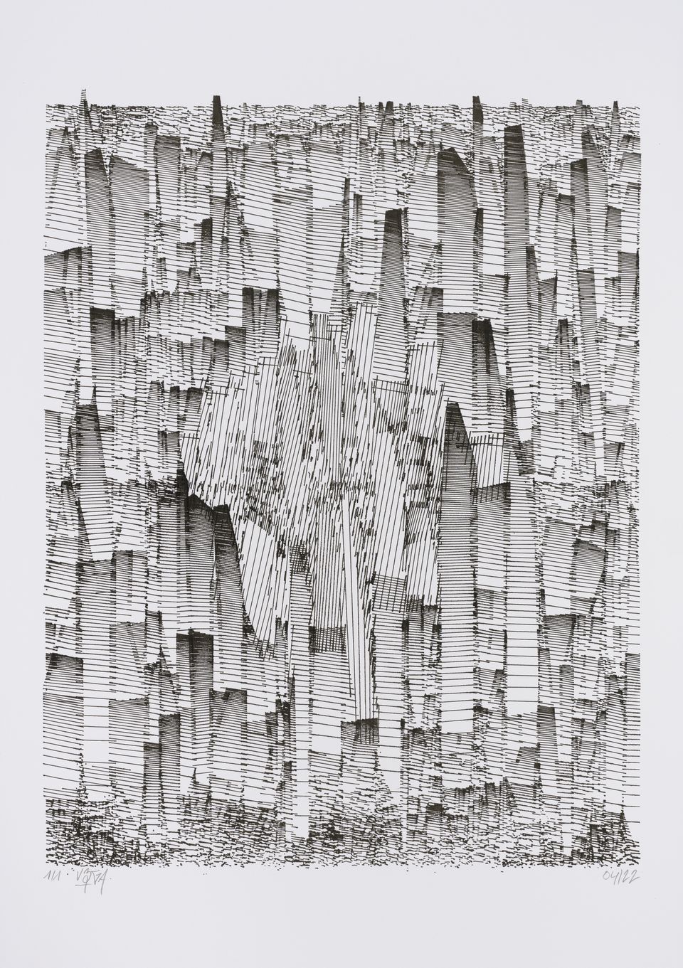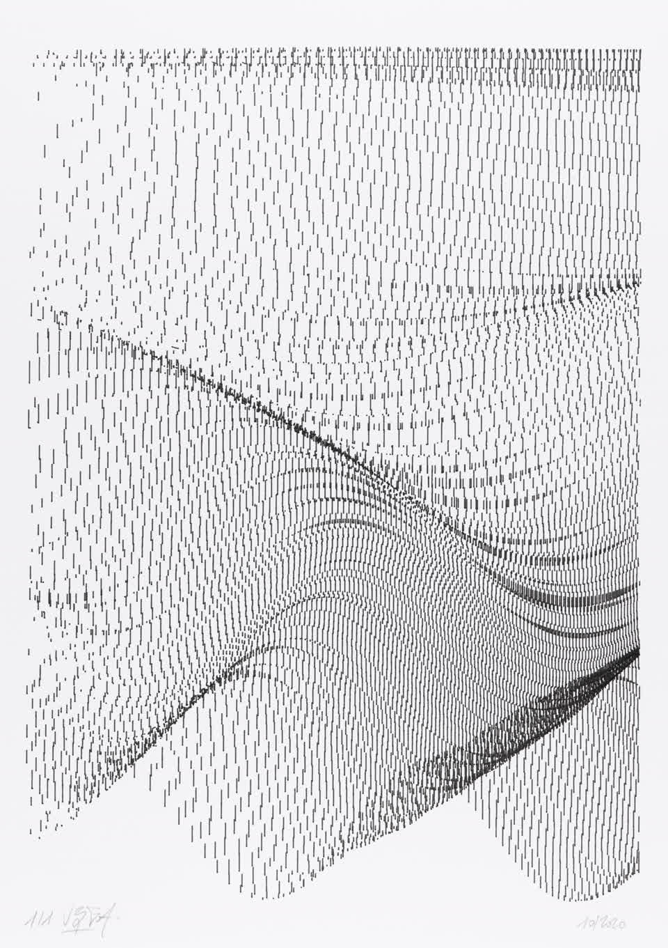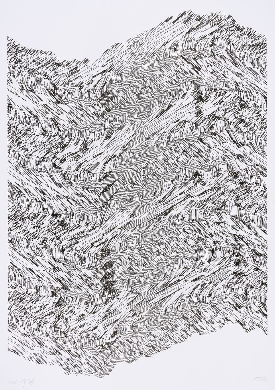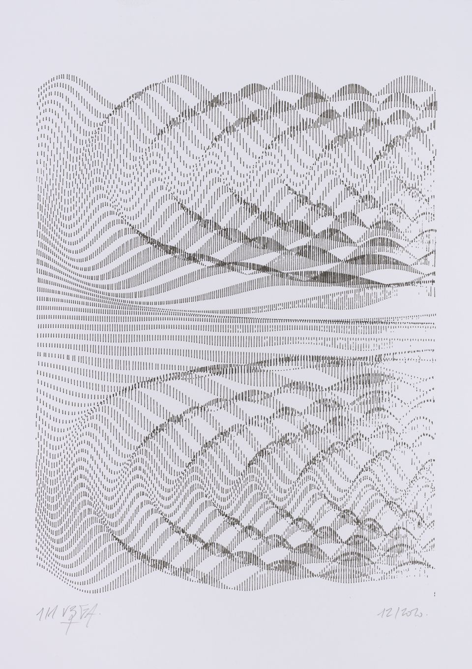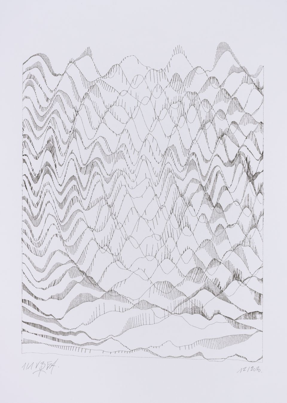The interstices between two sine waves are then filled with vertical stripes whose orientation and density depend on some spatial rules, but also random numbers which introduce irregularities and breakage areas, resulting in mountain-like drawings.