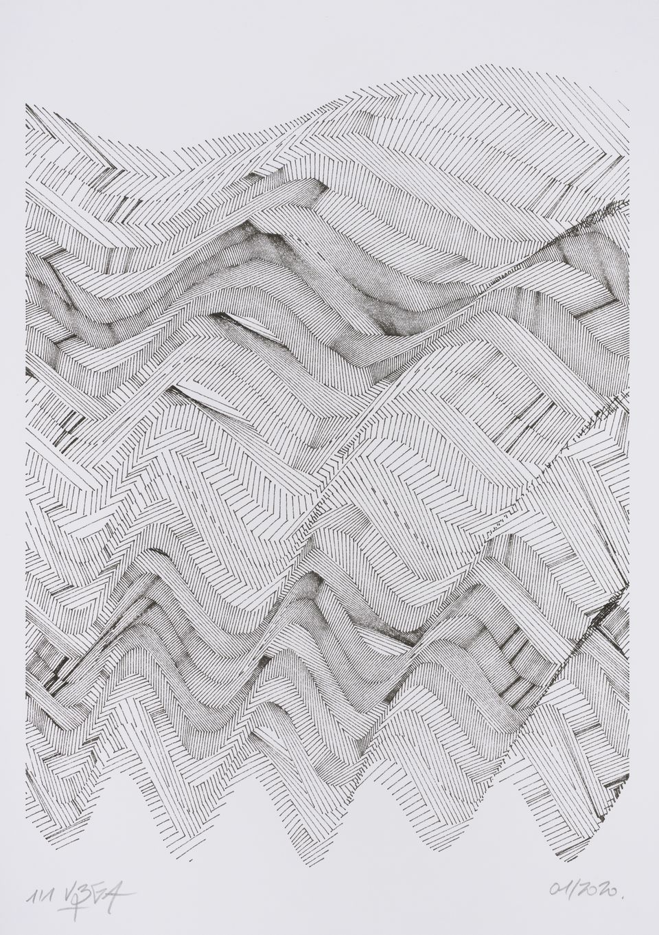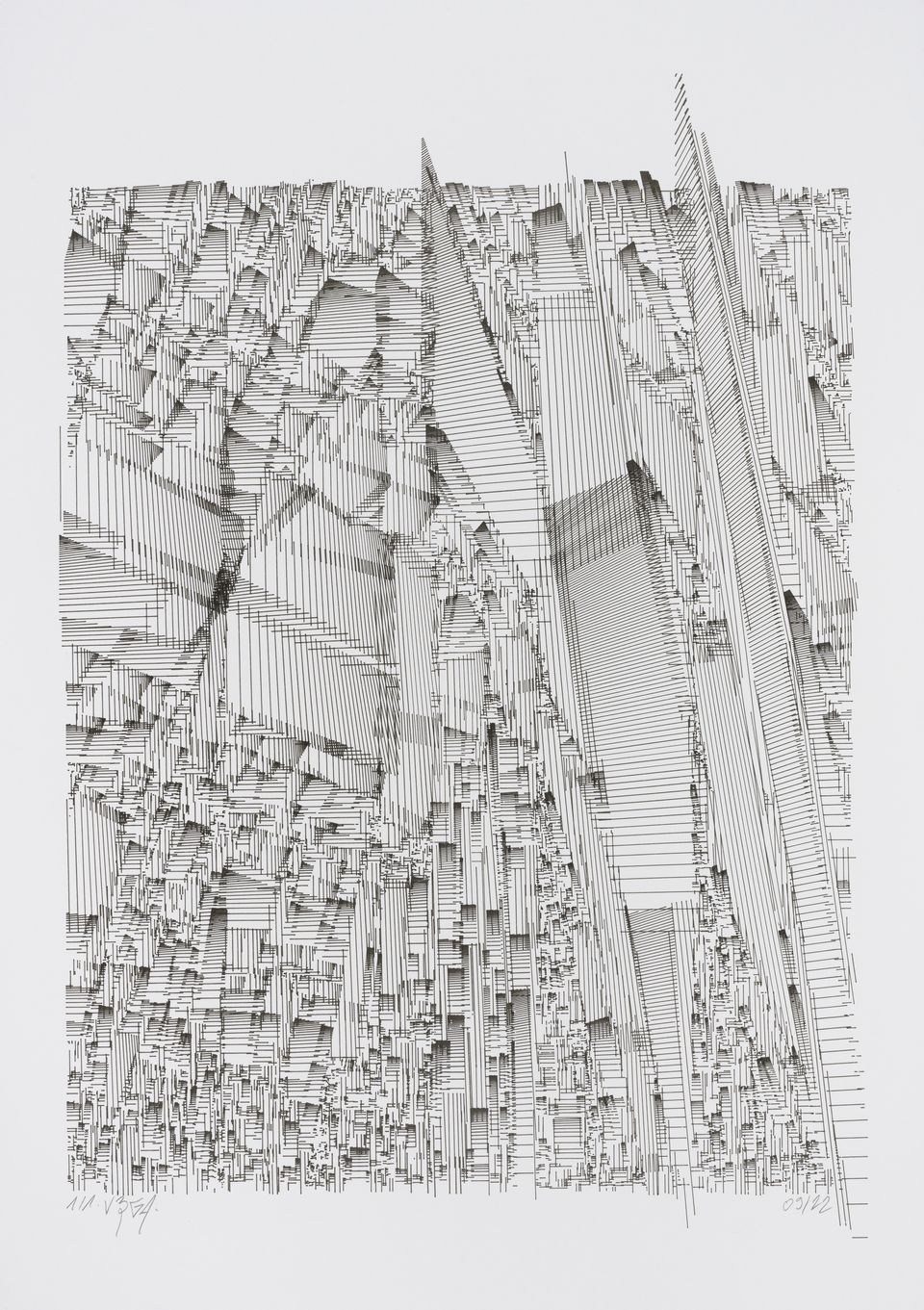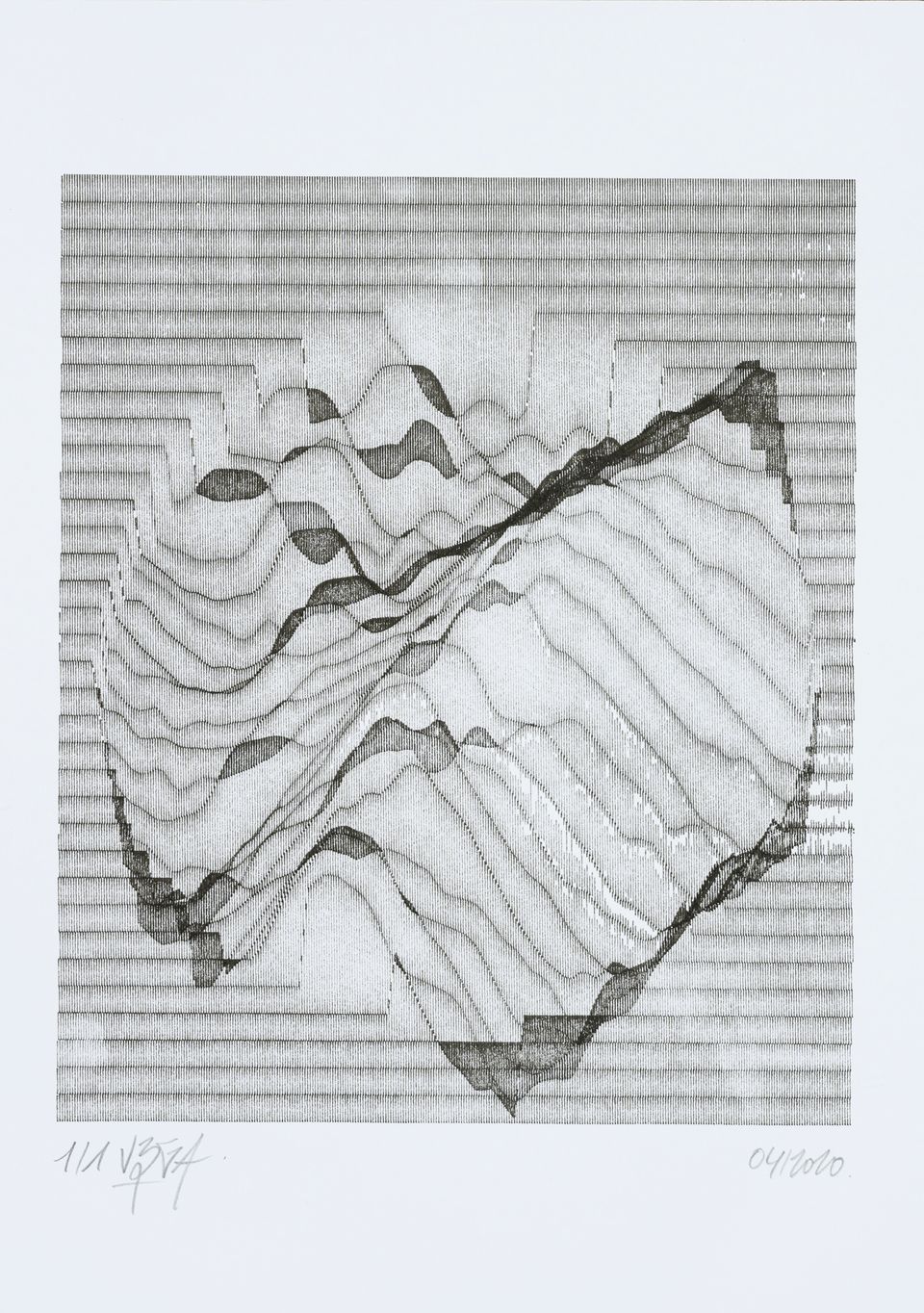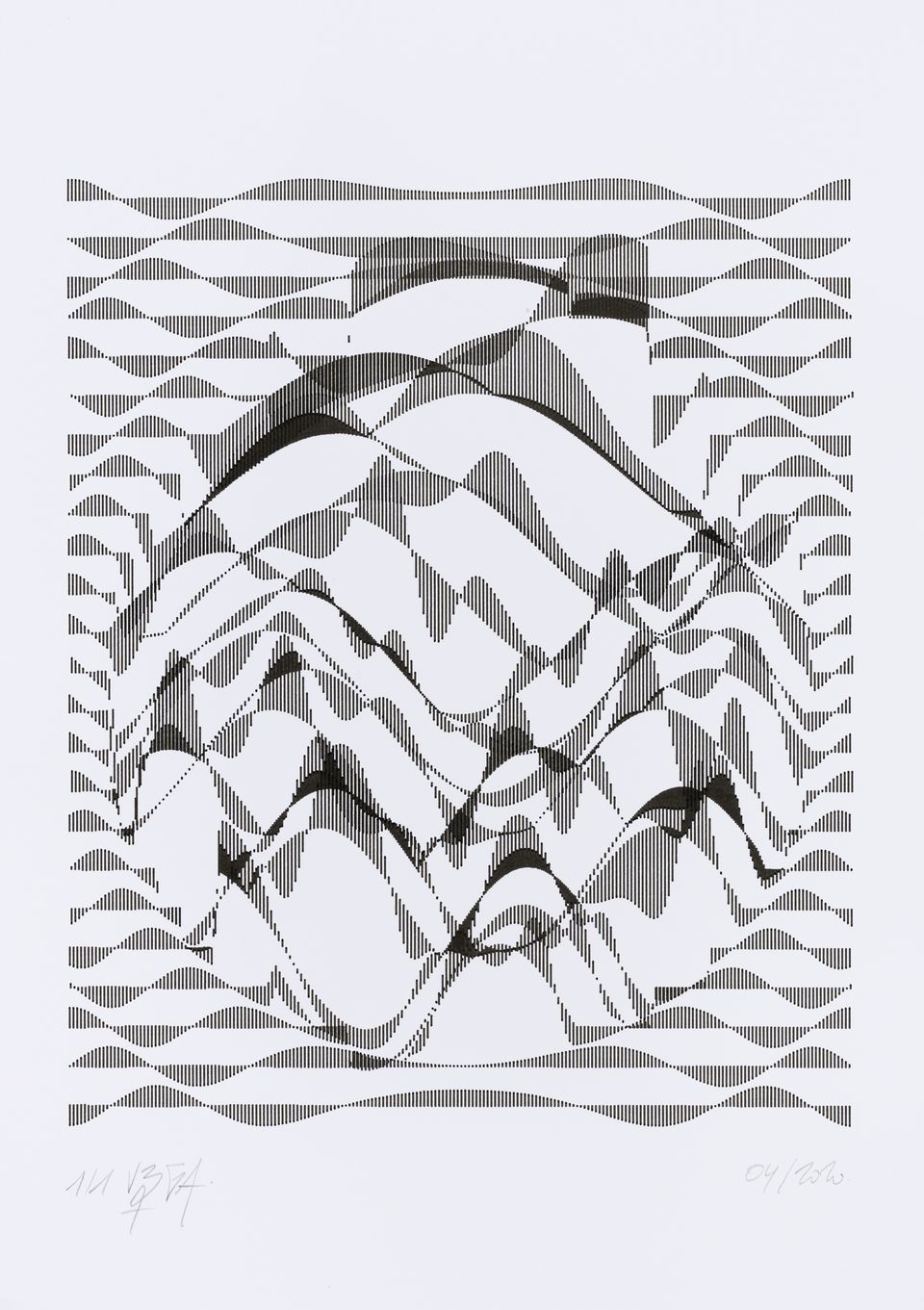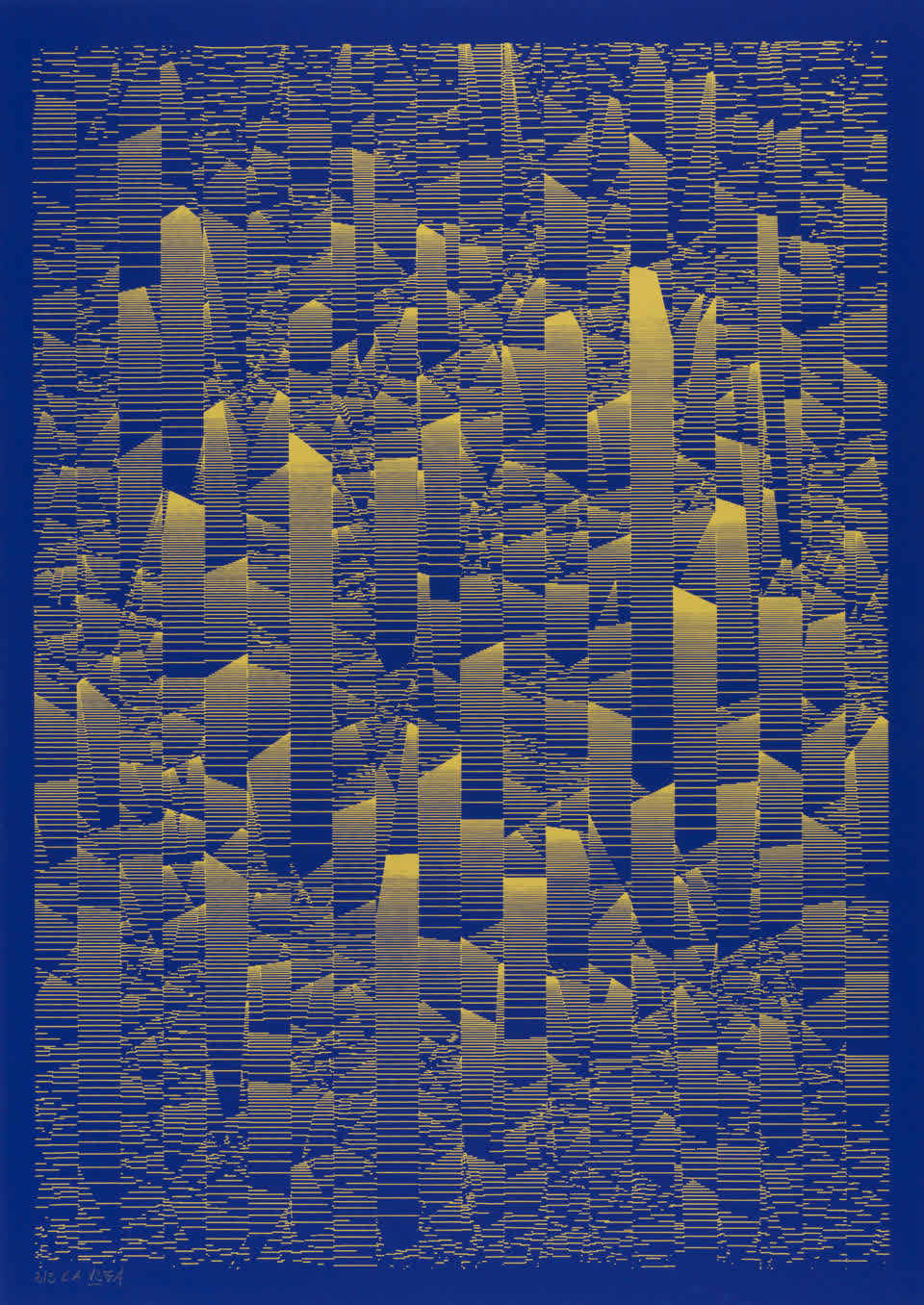 The interstices between two sine waves are then filled with vertical stripes whose orientation and density depend on some spatial rules, but also random numbers which introduce irregularities and breakage areas, resulting in mountain-like drawings.