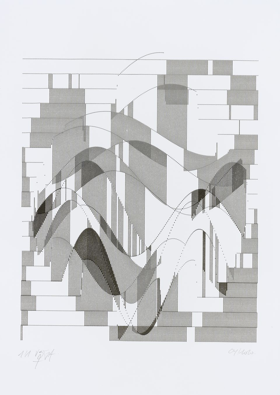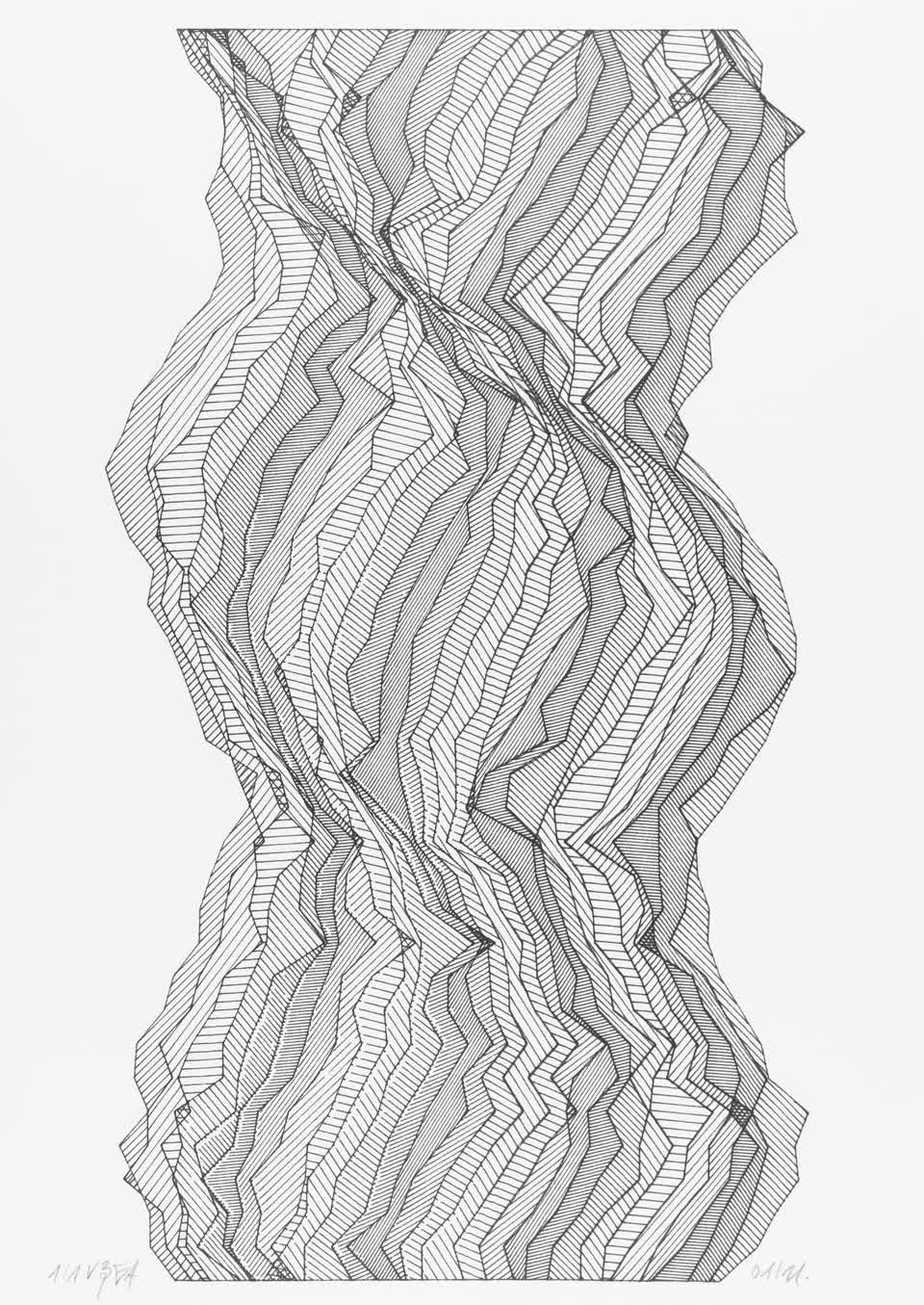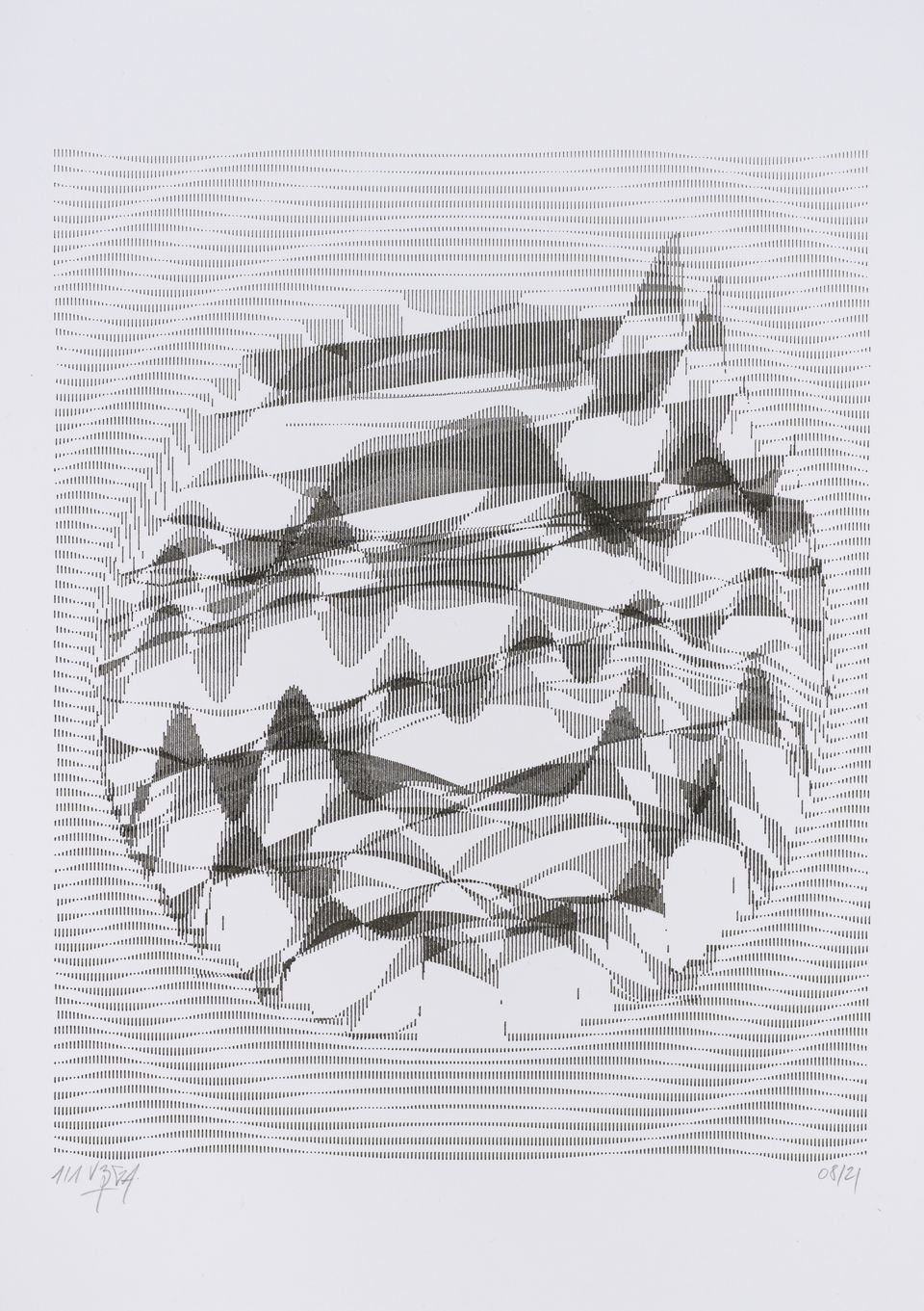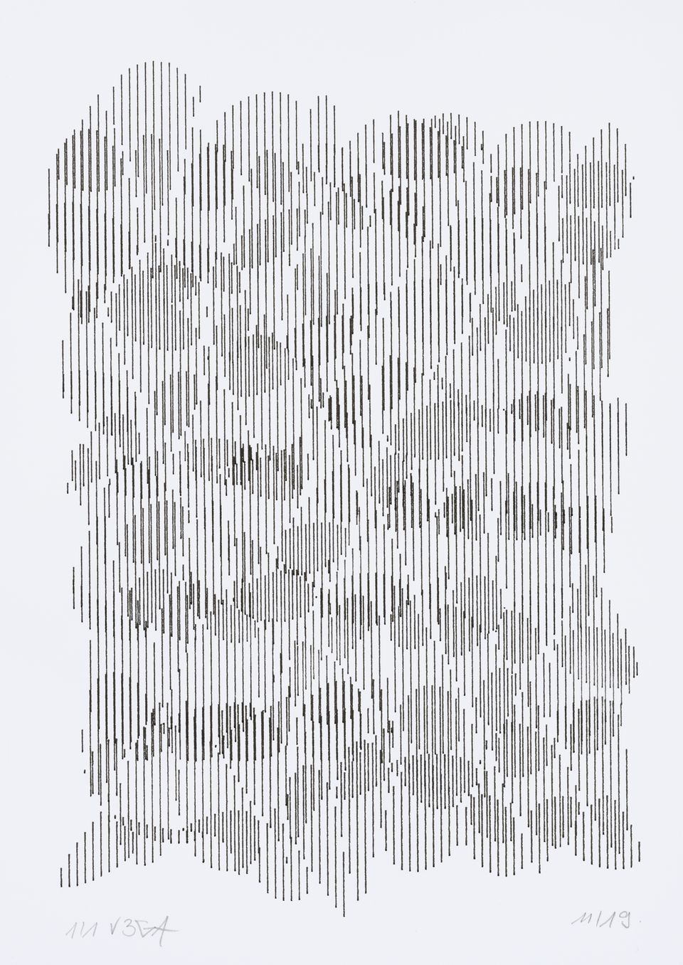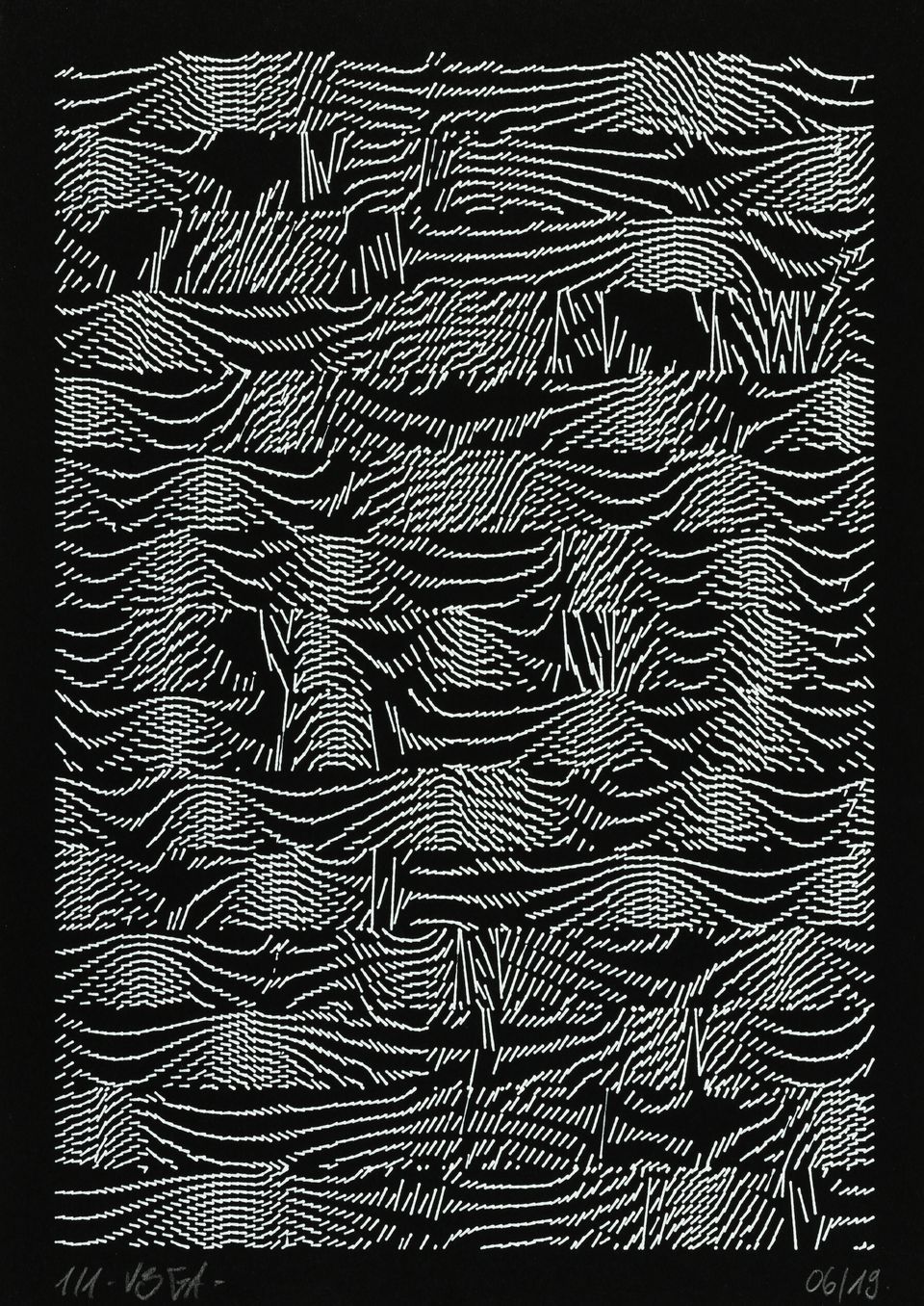 The interstices between two sine waves are then filled with vertical stripes whose orientation and density depend on some spatial rules, but also random numbers which introduce irregularities and breakage areas, resulting in mountain-like drawings.
