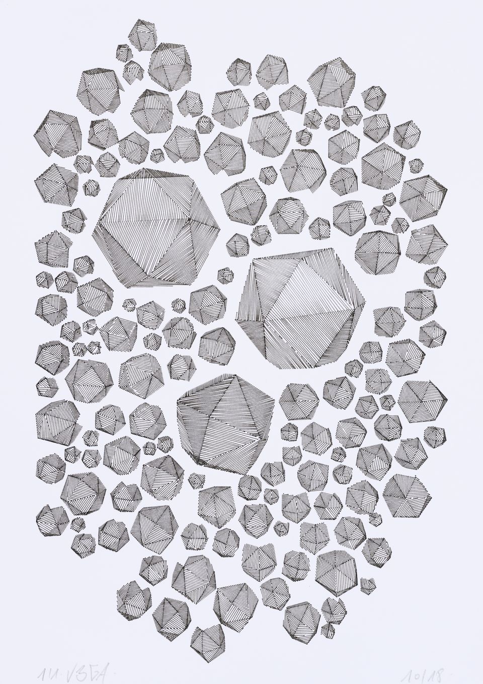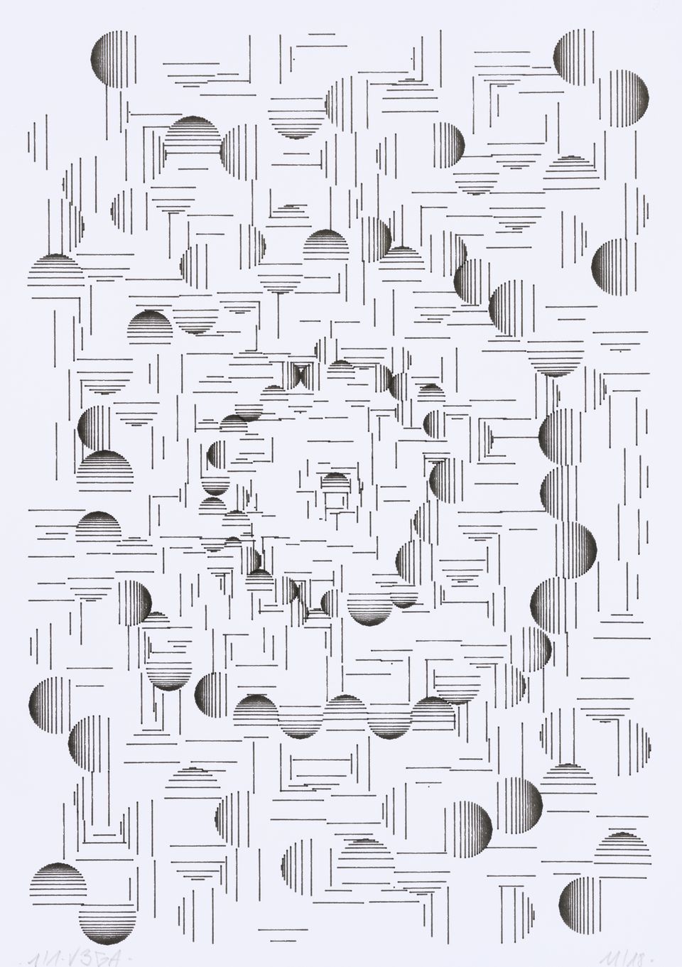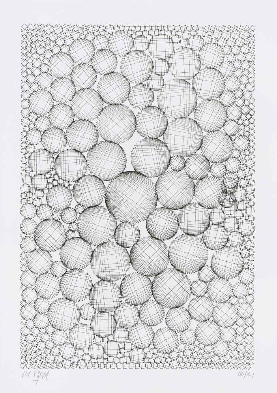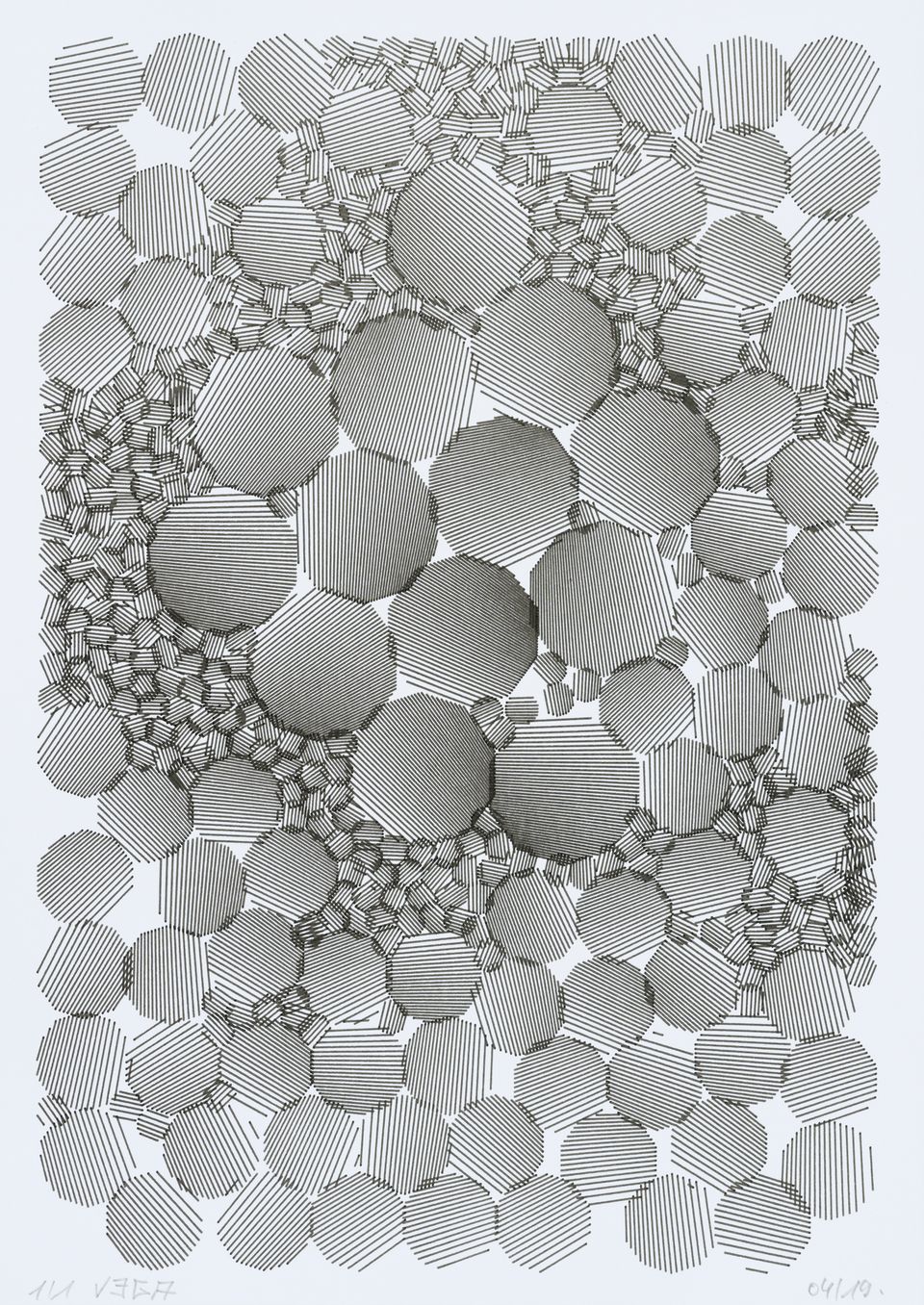 The algorithm used for these drawings is known as circle-packing. It allows to place a set of non-intersecting circles inside a closed surface. The process of composition is semi-random, as the position of the circles is manually selected, whereas their diameters are chosen according to spatial but also random rules. The circles are then filled with lines whose spacing and orientation are tied to the position of their parent circle.