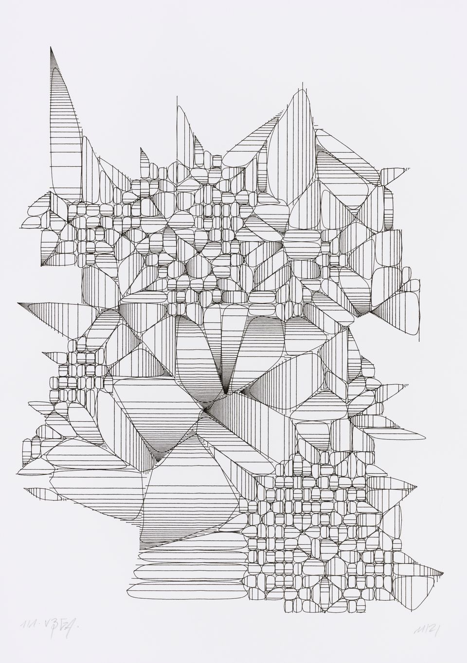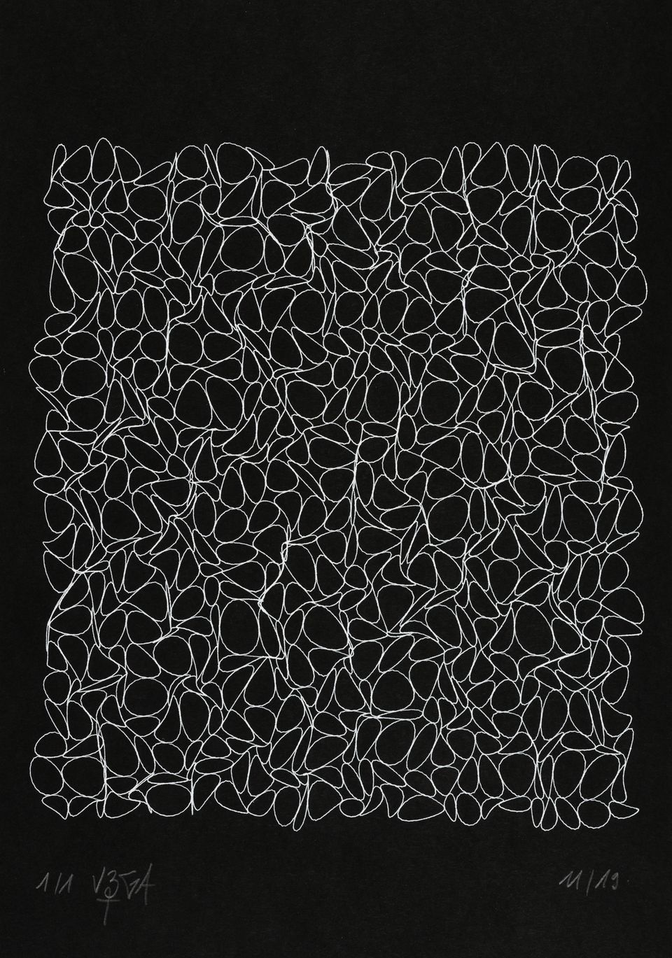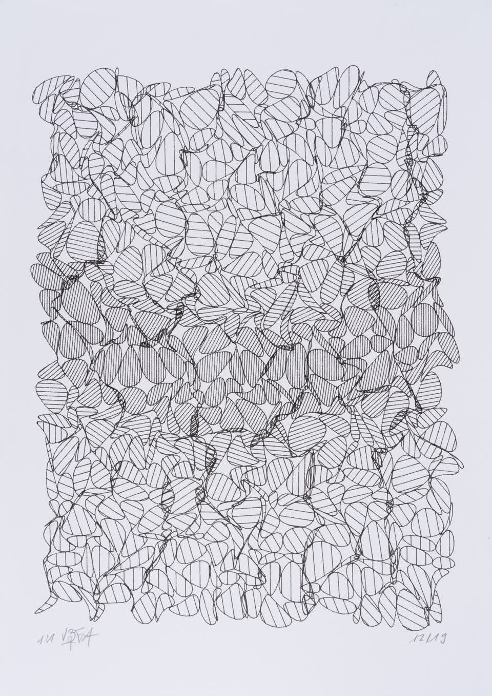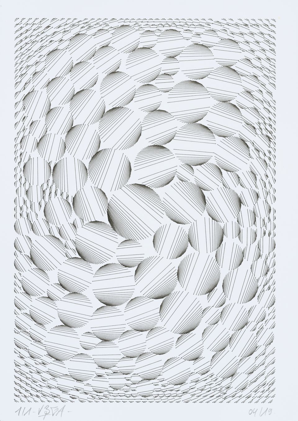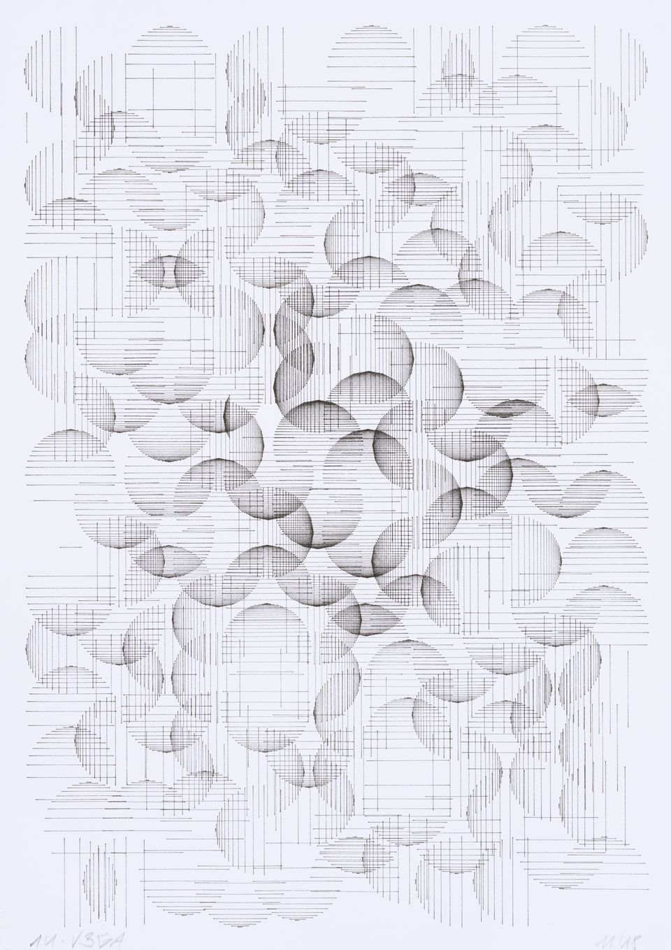 The algorithm used for these drawings is known as circle-packing. It allows to place a set of non-intersecting circles inside a closed surface. The process of composition is semi-random, as the position of the circles is manually selected, whereas their diameters are chosen according to spatial but also random rules. The circles are then filled with lines whose spacing and orientation are tied to the position of their parent circle.
