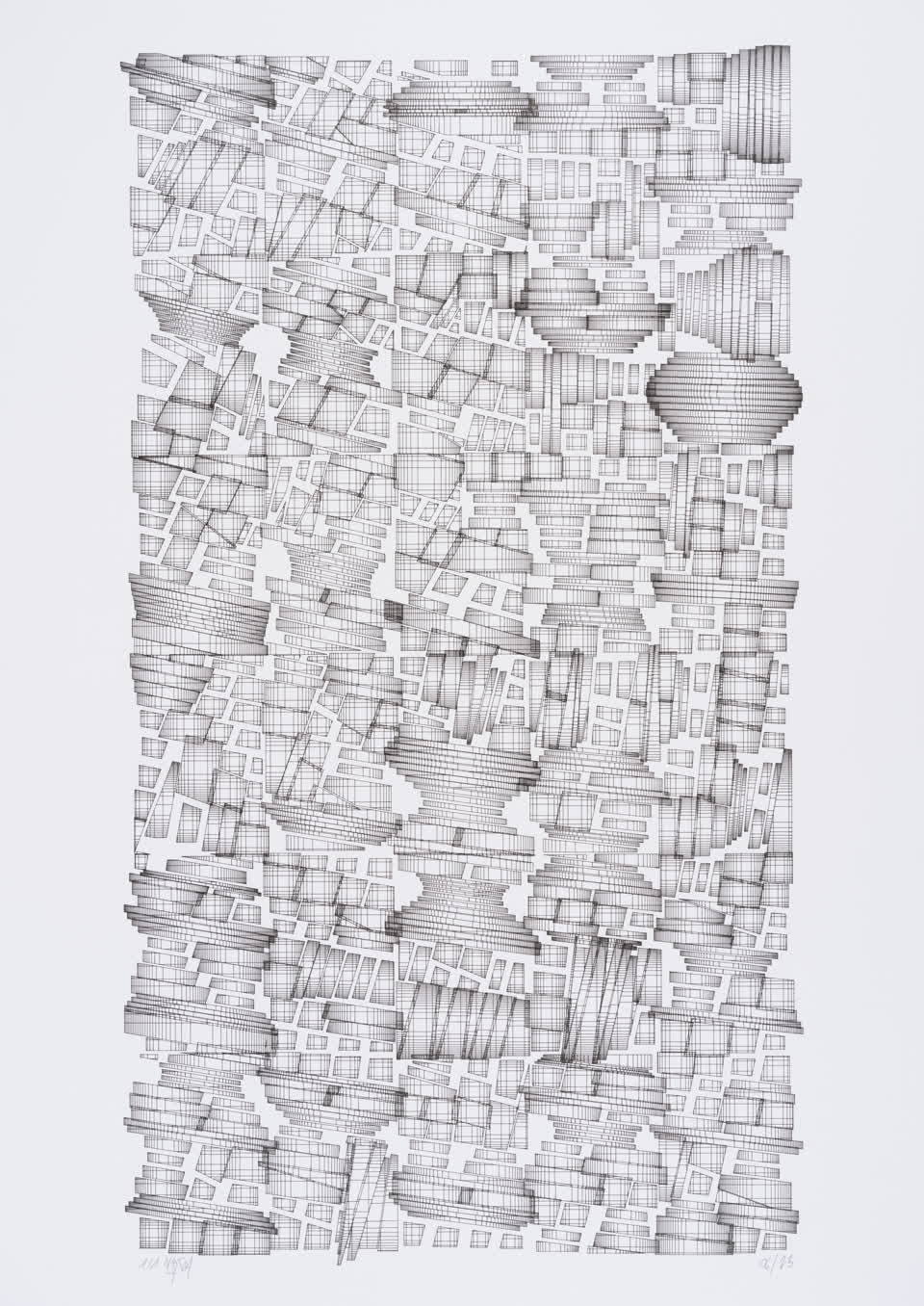 The Towers series uses a particular configuration of the “Subdivision” algorithm. Not only are the lines covering the geometric shapes distributed in a non-linear manner, but their orientation can simply take two values depending on whether they are present inside a circle or not.