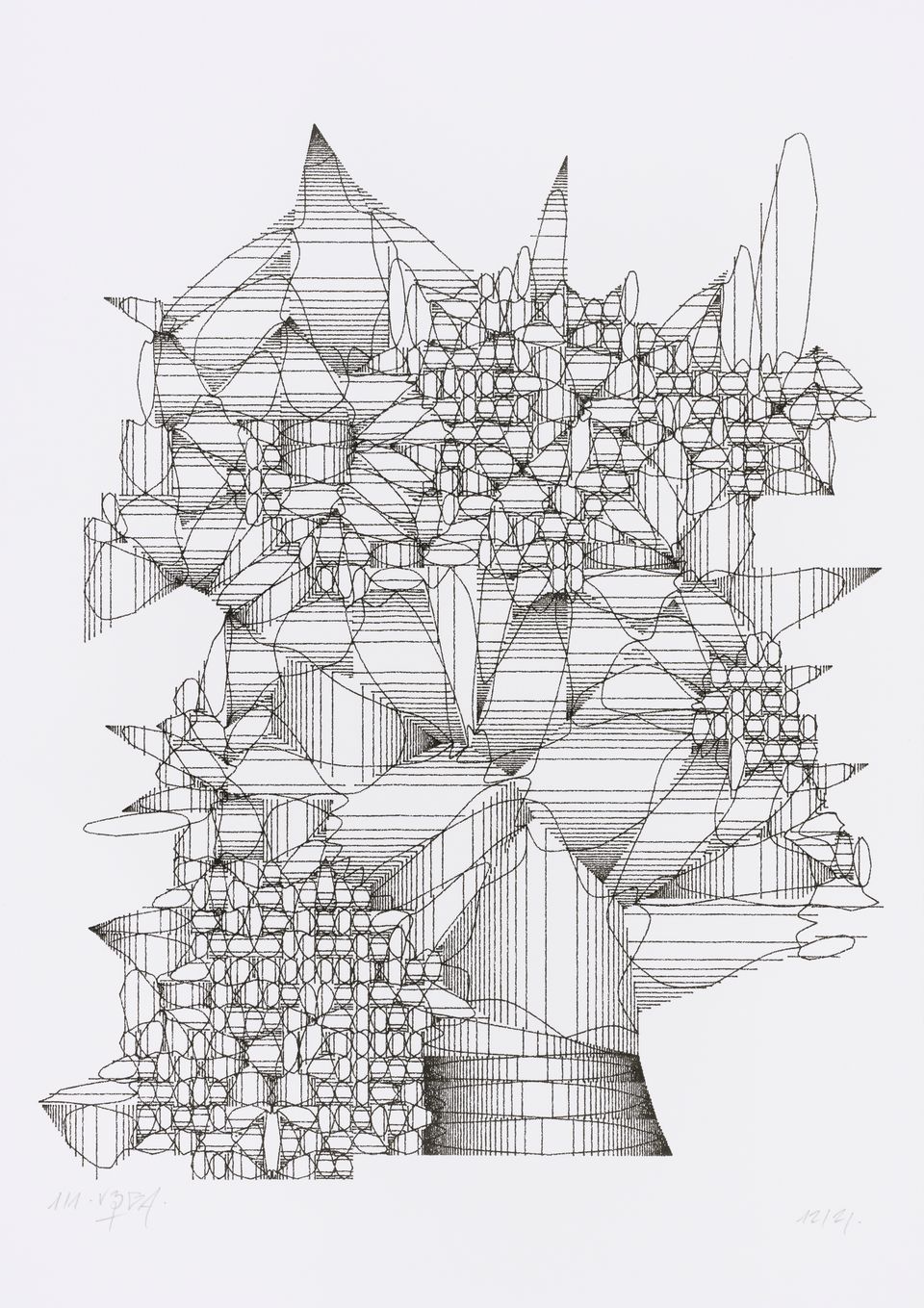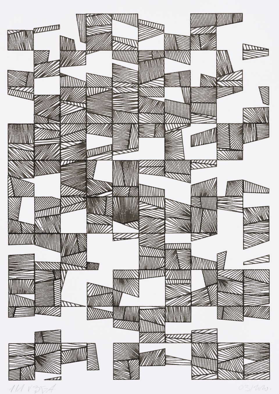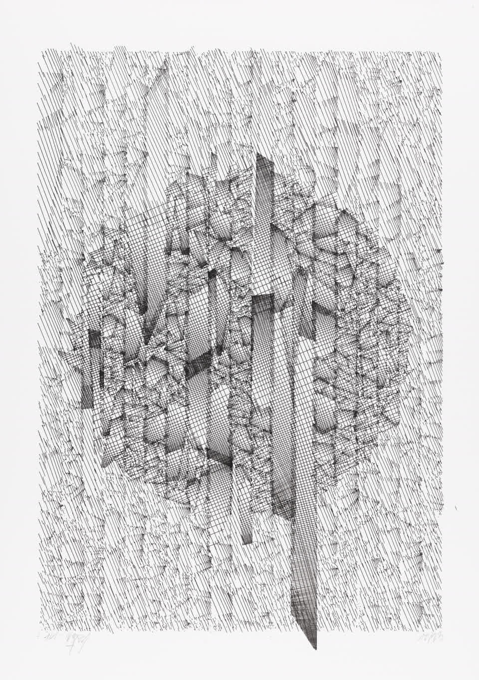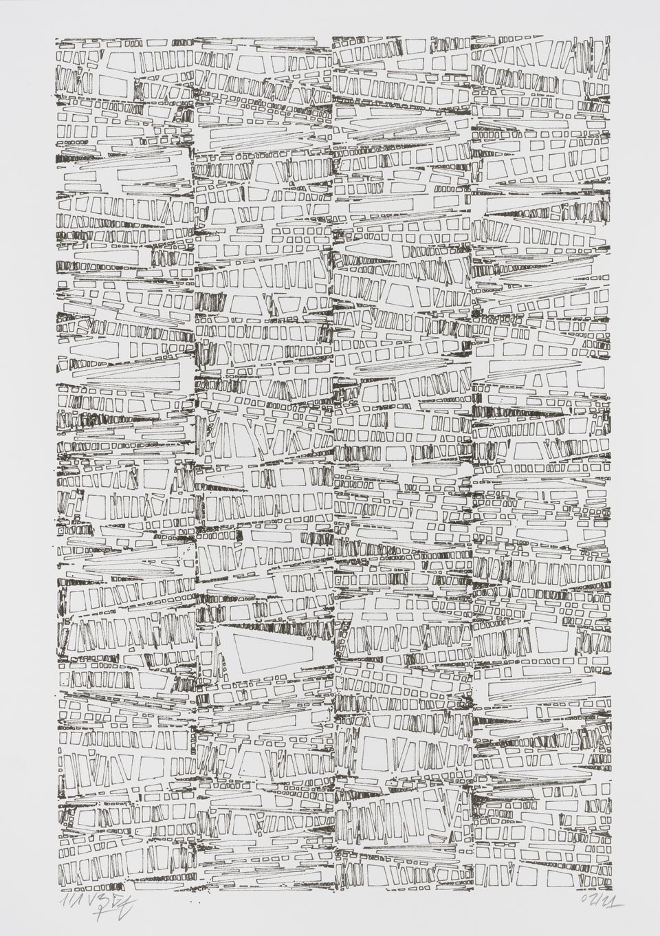 The starting shape here is a set of vertical columns rather than a single rectangle. The cuts are made perpendicular to the sides of the columns, giving this rigid appearance, which can sometimes evoke the cogs of an imaginary mechanical machine or the plan of a city.