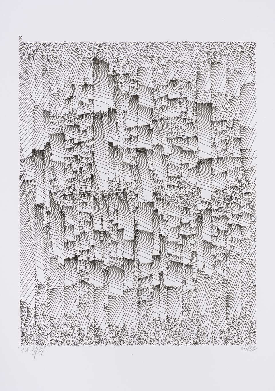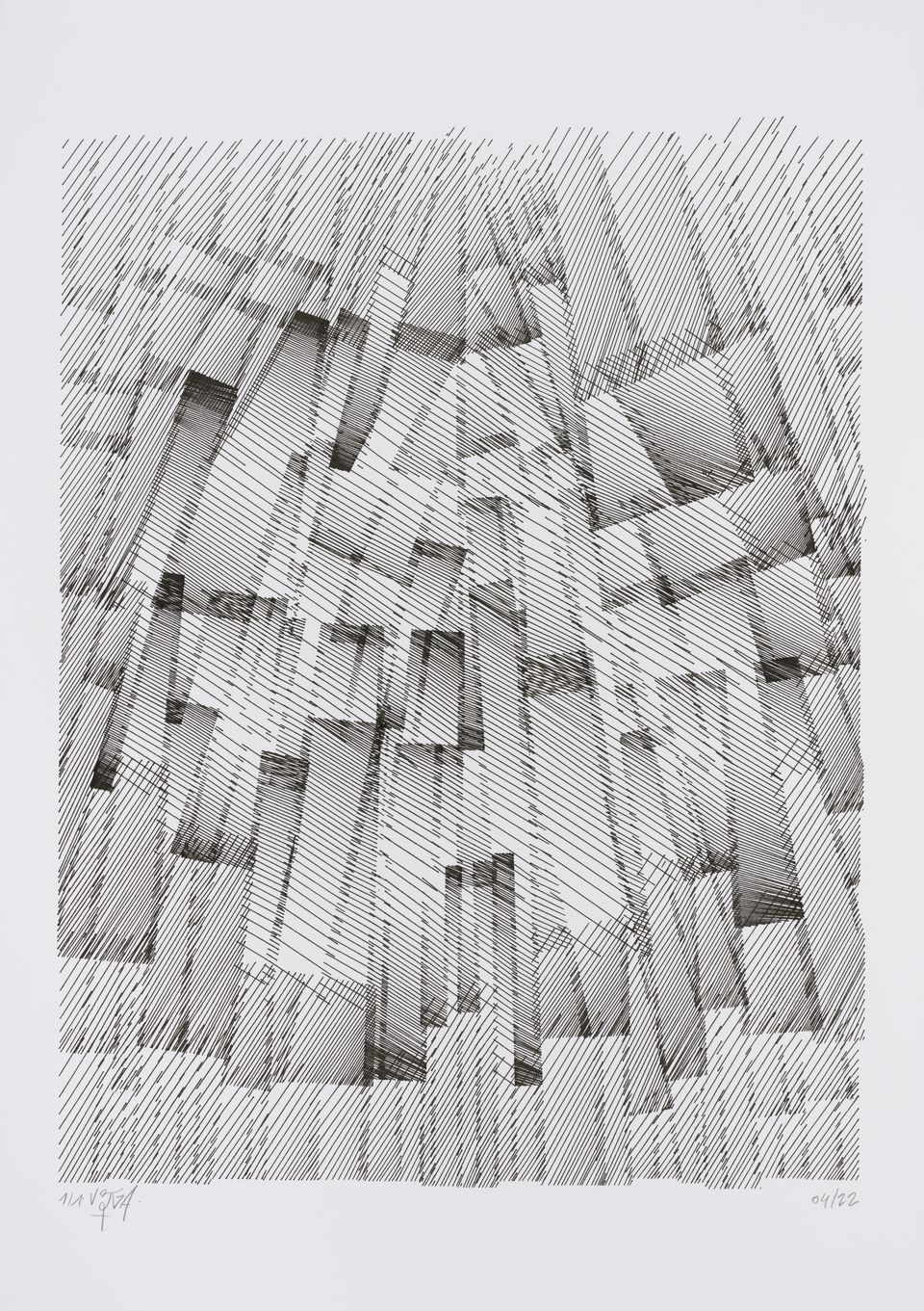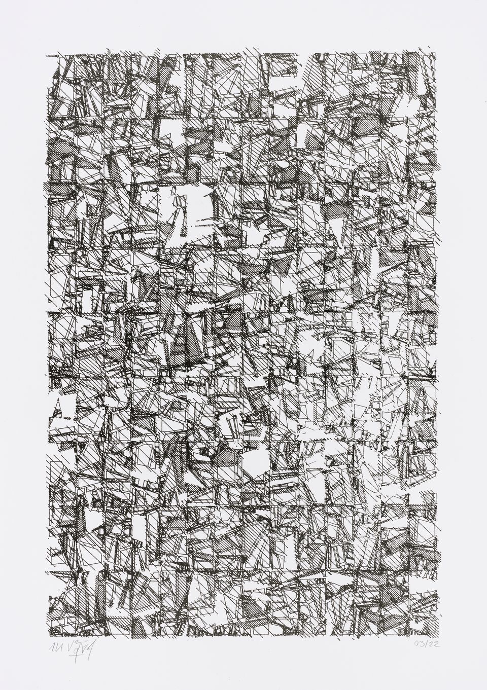 The starting shape here is a set of vertical columns rather than a single rectangle. The cuts are made perpendicular to the sides of the columns, giving this rigid appearance, which can sometimes evoke the cogs of an imaginary mechanical machine or the plan of a city.