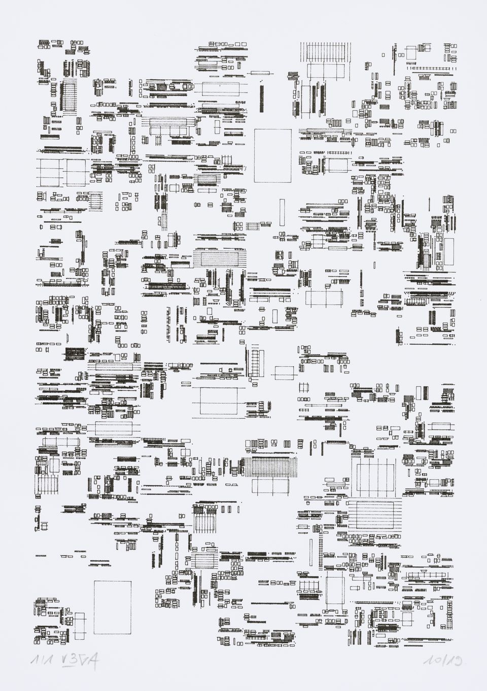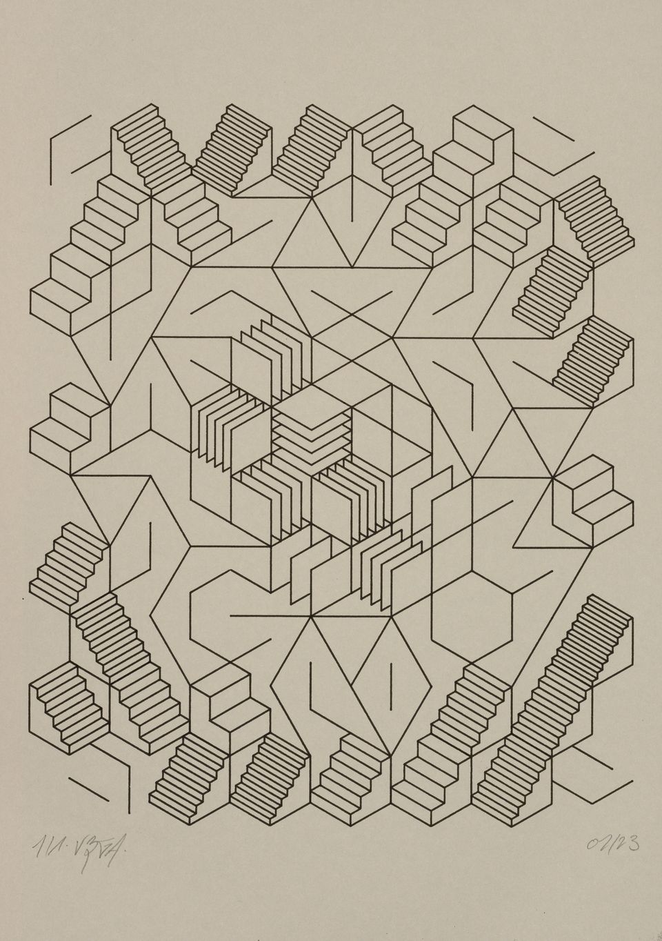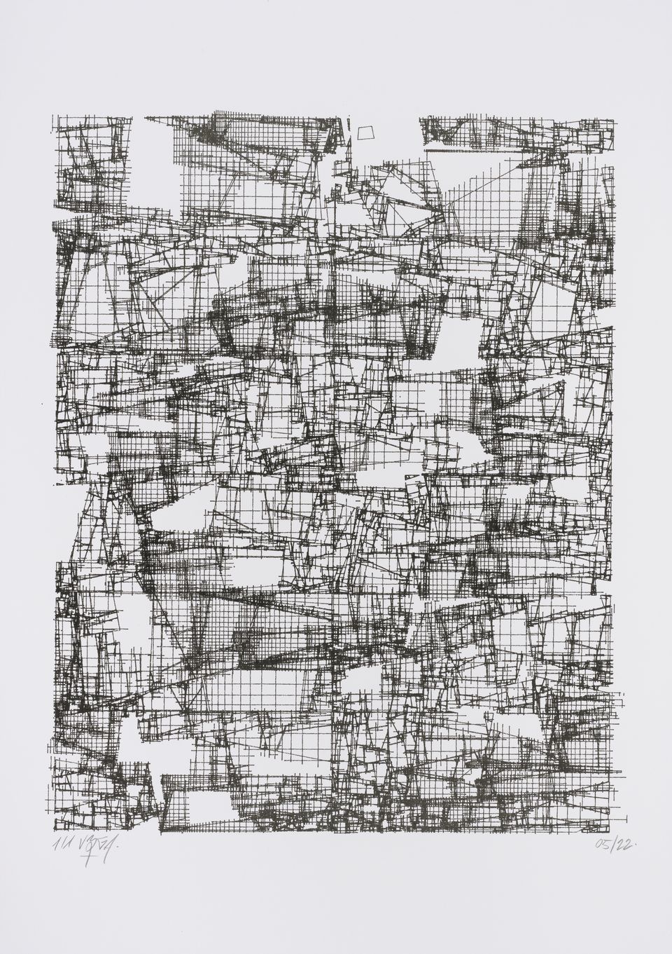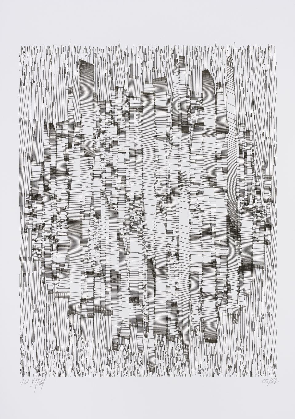 The starting shape here is a set of vertical columns rather than a single rectangle. The cuts are made perpendicular to the sides of the columns, giving this rigid appearance, which can sometimes evoke the cogs of an imaginary mechanical machine or the plan of a city.
