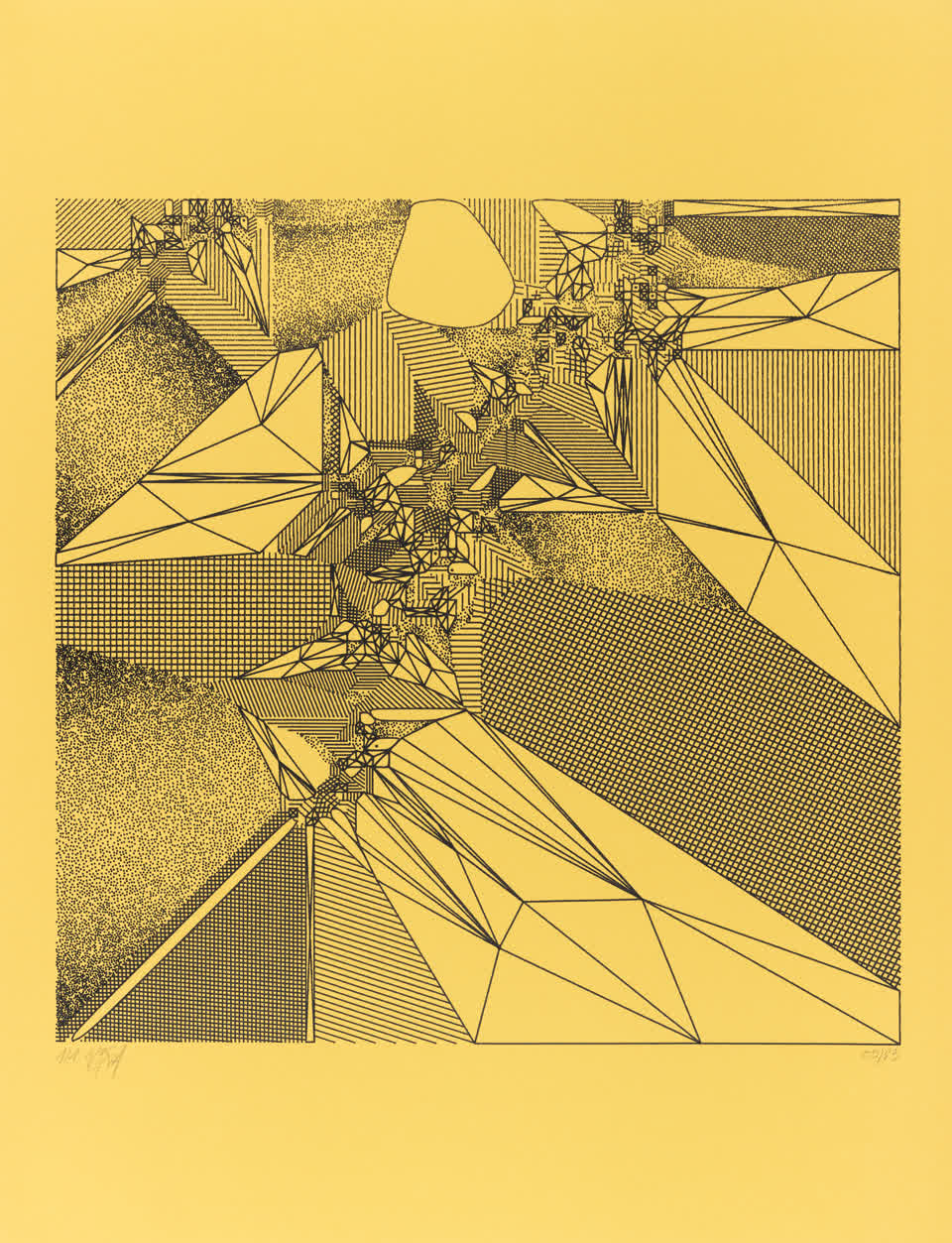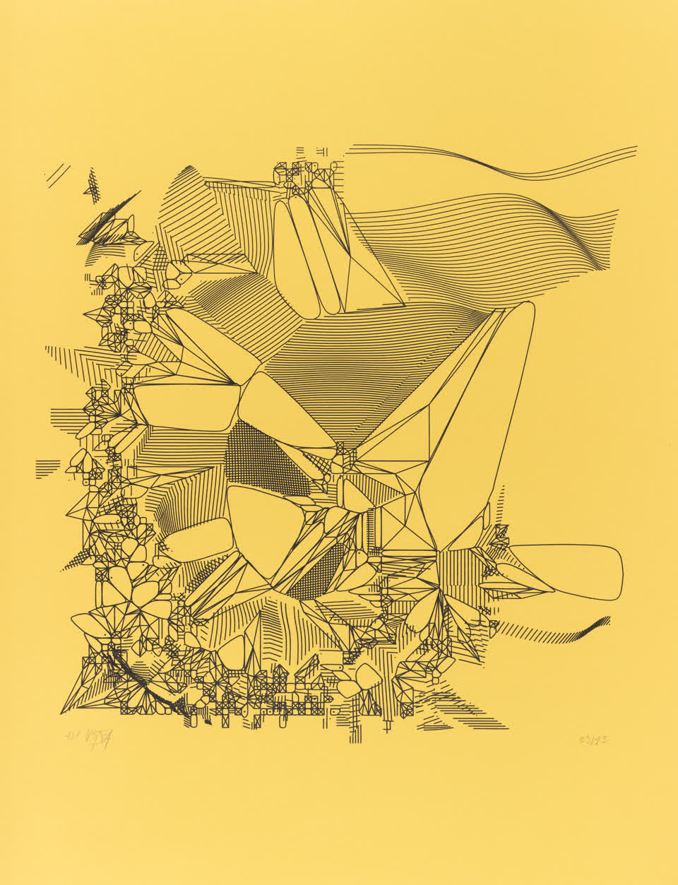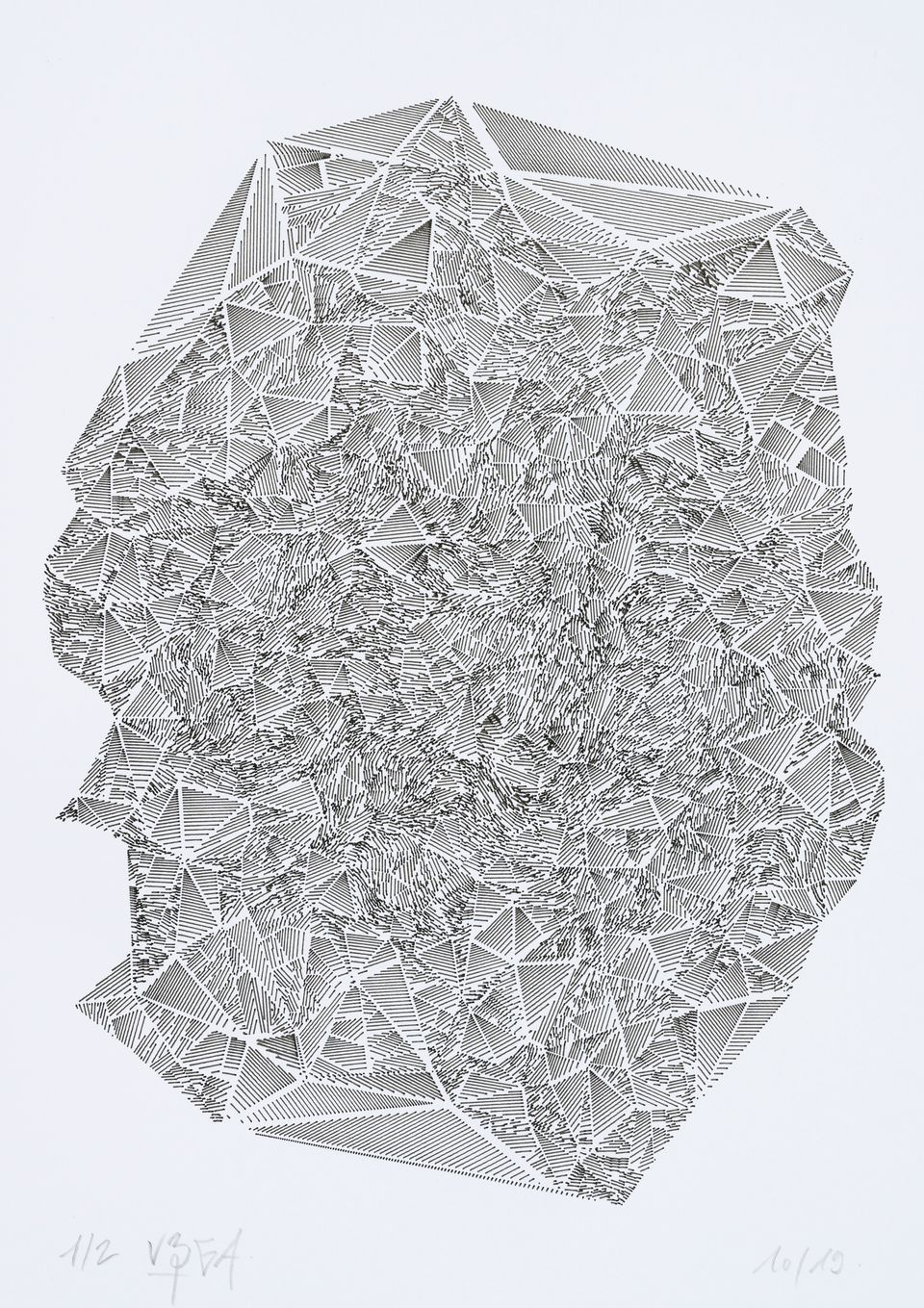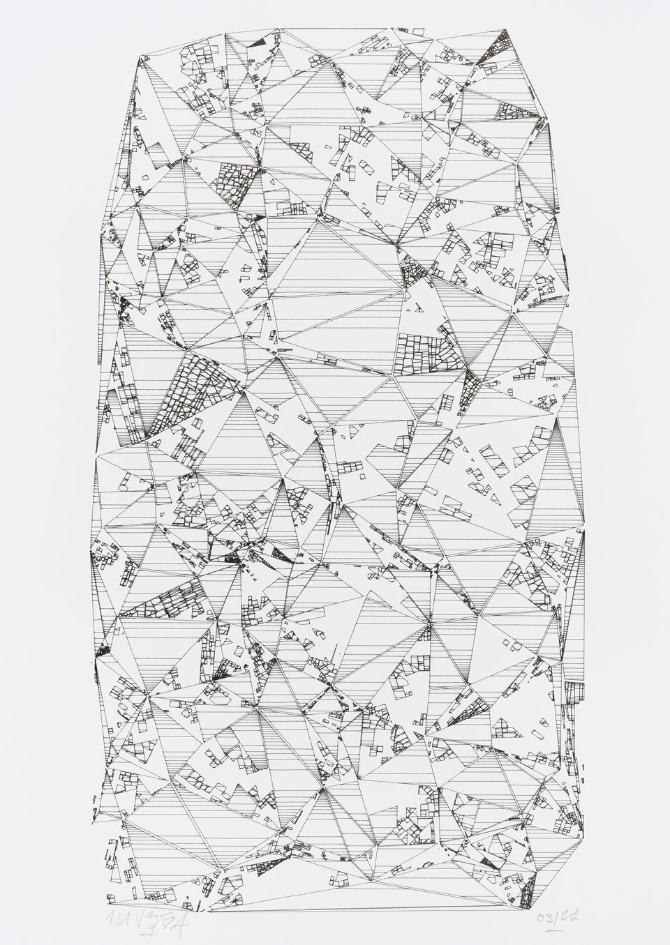 The starting point is no longer a single shape but a set of points distributed according to certain random distribution rules. From these points, “a Voronoï diagram” and “a Delaunay triangulation” are calculated, producing a set of triangles made of segments connecting all these points without possible crossing. The subdivision algorithm is applied to these triangles which are then covered by lines spaced according to spatial rules.