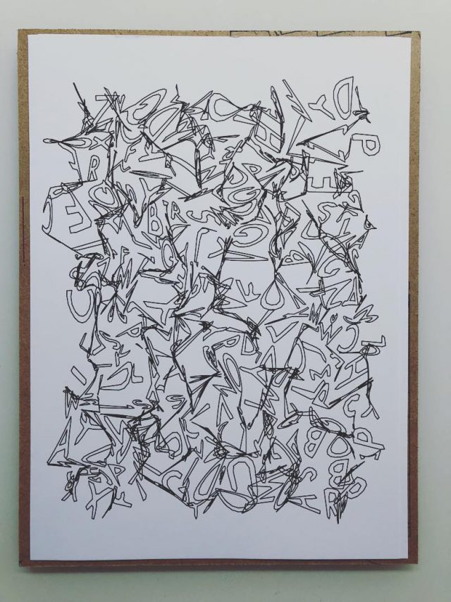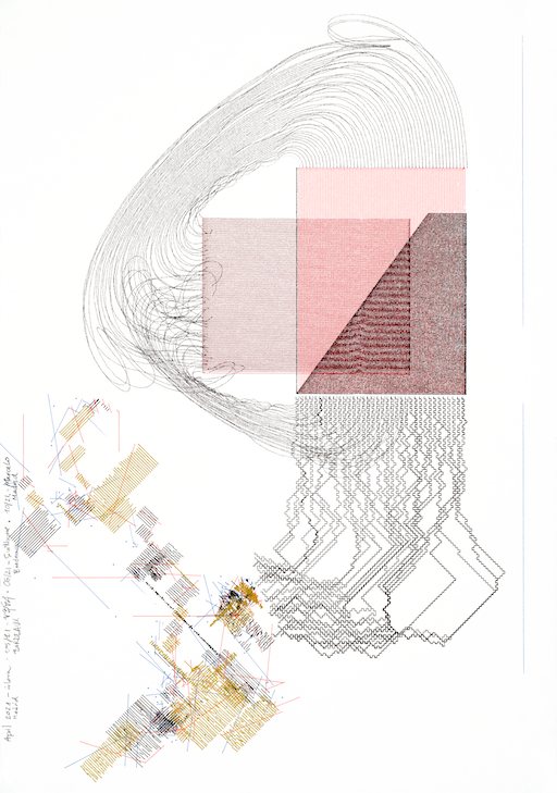 The drawing was produced using algorithms and plotters between April and October 2021, following the process of «exquisite corpse» invented by the surrealists. The plot traveled between Madrid and Bordeaux, each artist performed a new drawing by only seeing a tiny portion of the previous drawing. It was not until the last drawing that the artists were able to discover their mutual composition.
