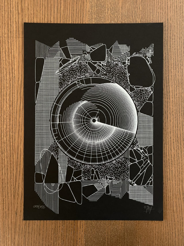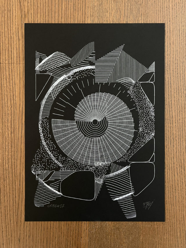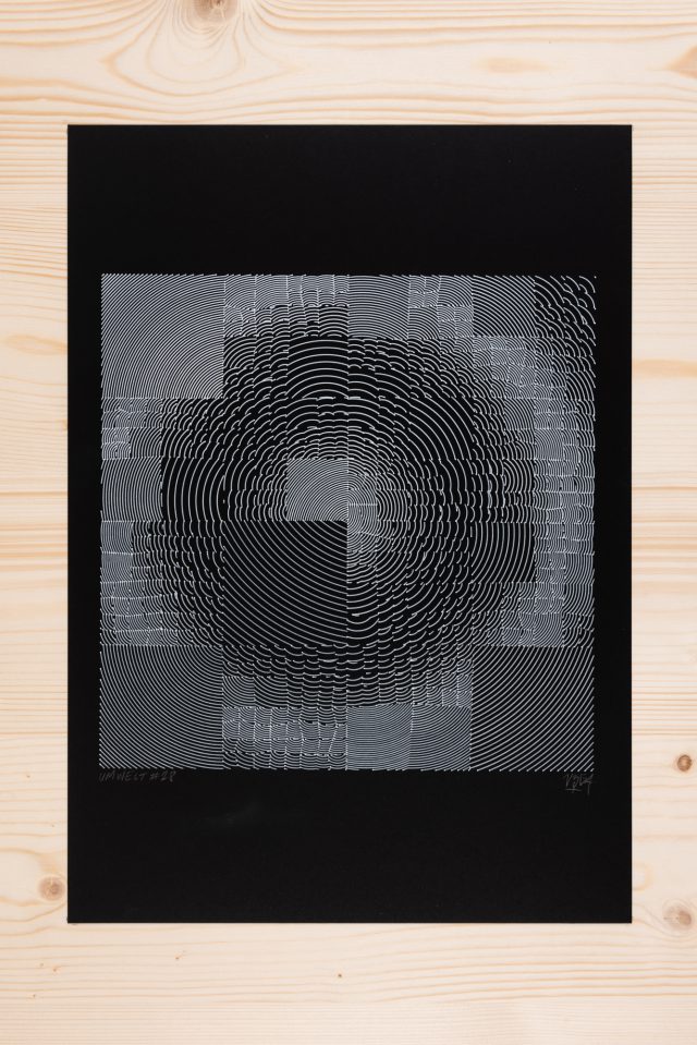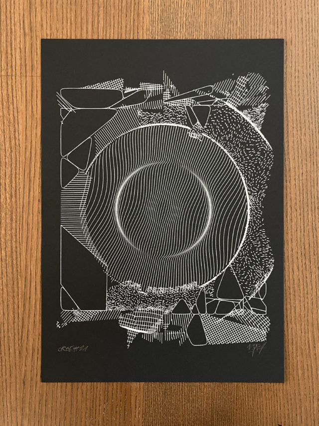 A circle of variable radius and several rectangles create the foundational structure of the “Orbe” series. Lines stemming from geometric interactions weave through each output, gradually revealing the piece’s unique rules of spatial construction.