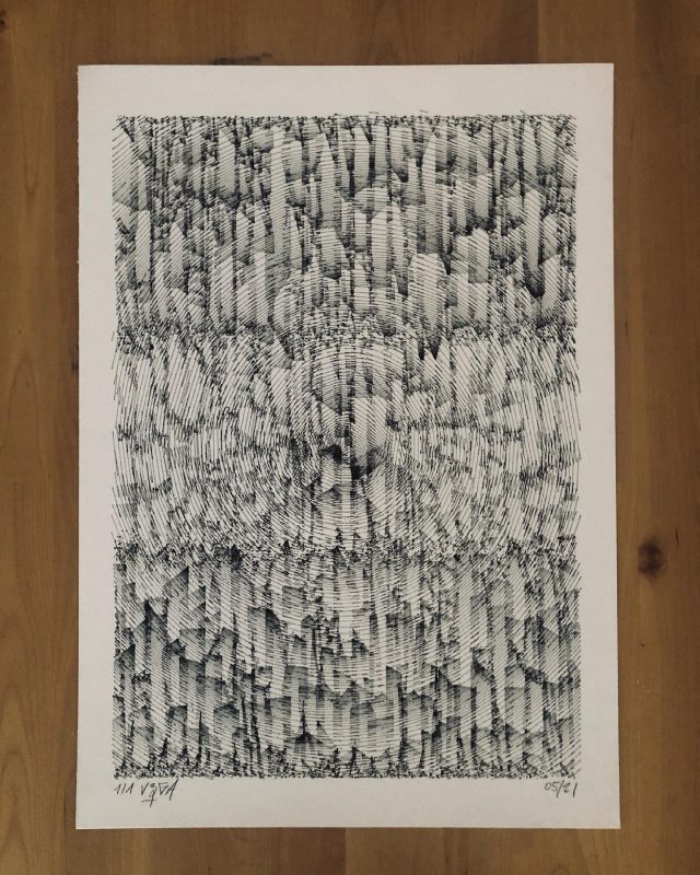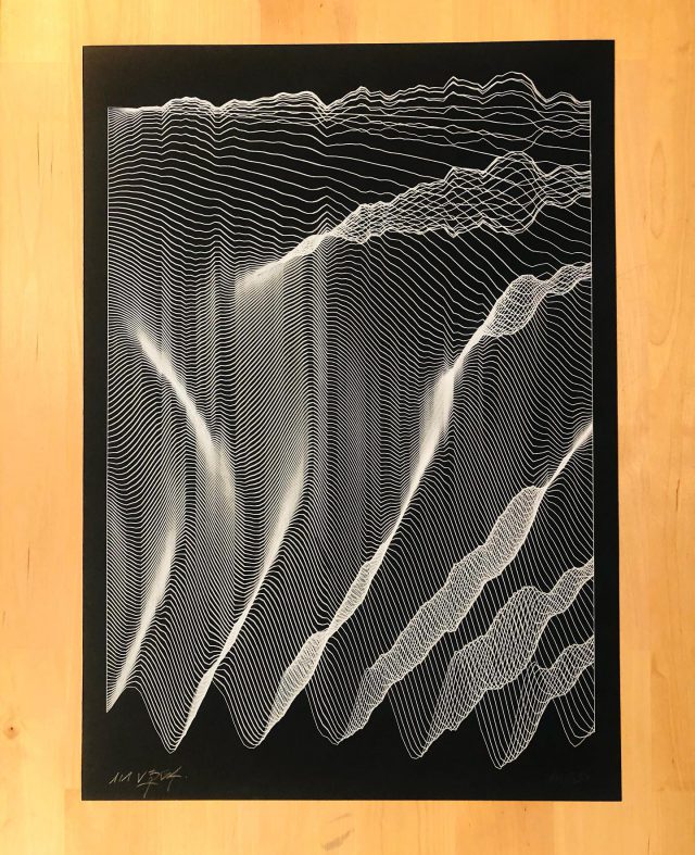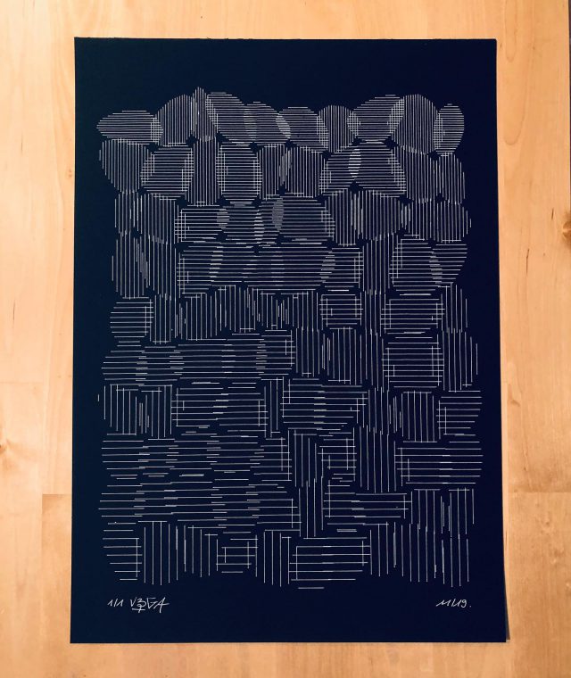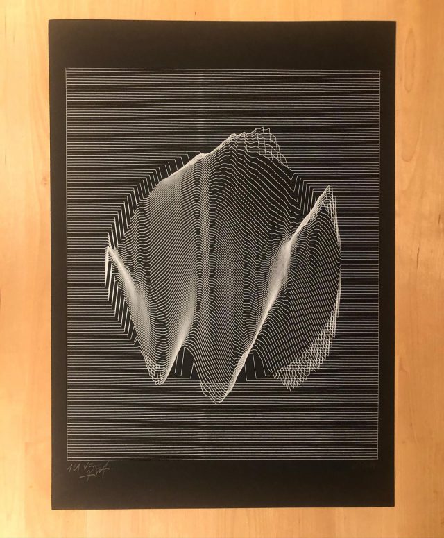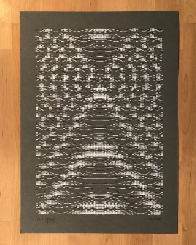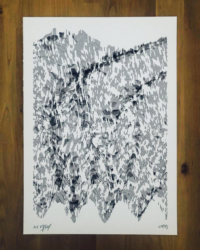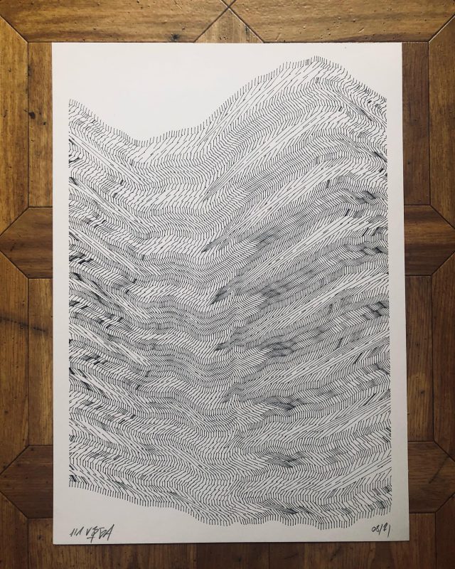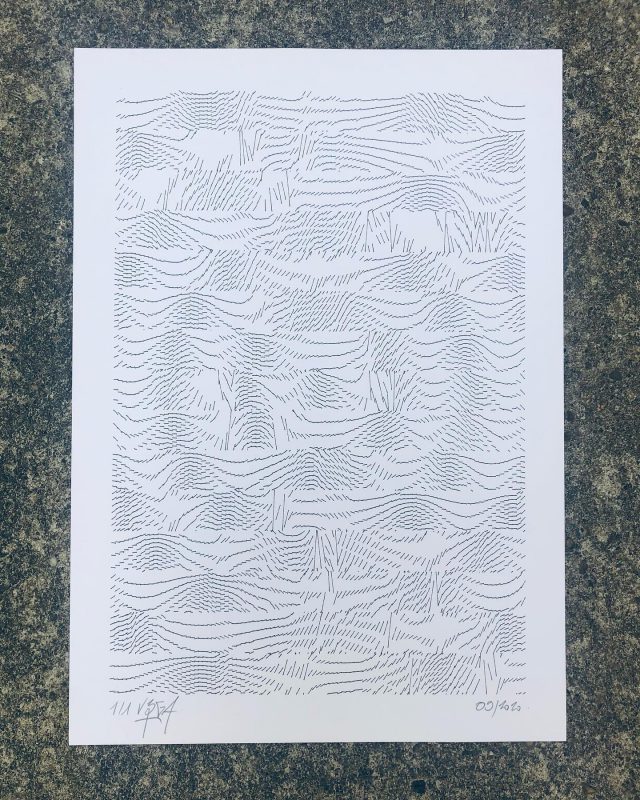 300 editions were printed using silkscreen printing technique while 8 original and unique sleeves were printed with an axidraw plotter, each one using the sound waveform of each track of the LP.