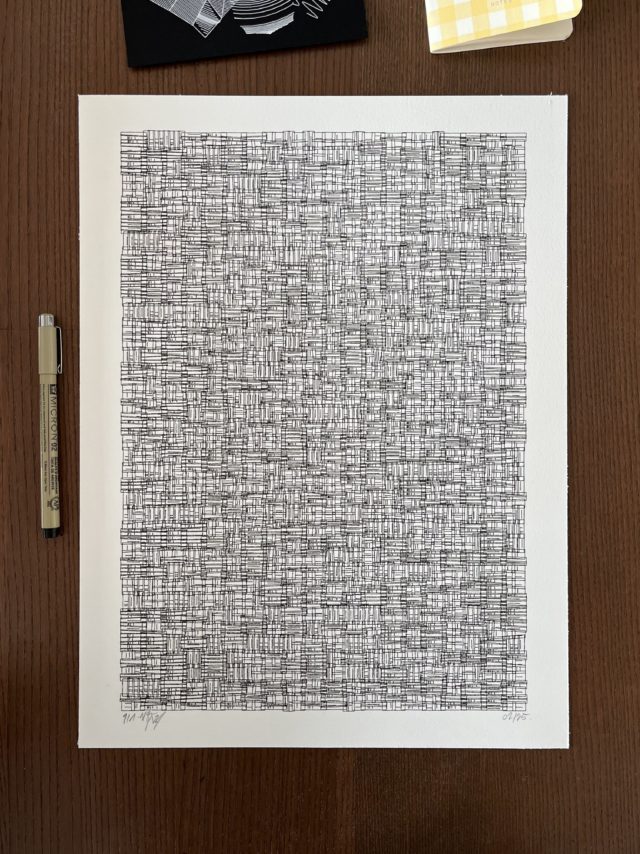 Structures has 20 possible combinations of 15 geometric patterns with 5 different palettes. Each palette was chosen based on available paper and ink colors for printing with a plotter.